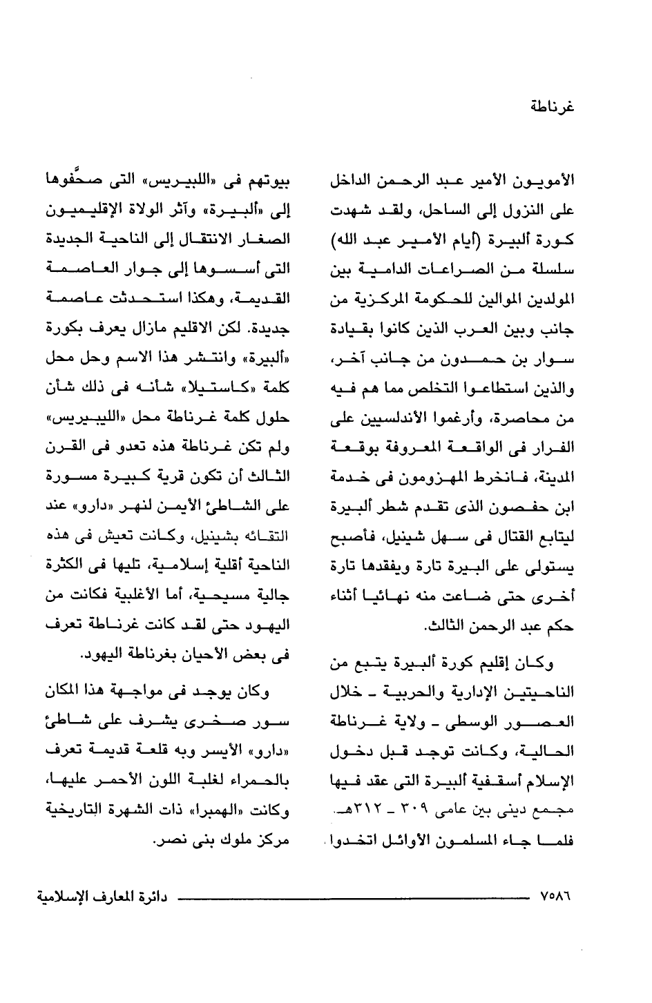 وكان إقليم كورة ألبيرة يتبع من الناحيتين الإدارية والحربية -خلال العصور الوسطى- ولاية غرناطة الحالية، وكانت توجد قبل دخول الإسلام أسقفية البيرة التى عقد فيها مجمع دينى بين عامى 309 - 312 هـ. فلما جاء المسلمون الأوائل اتخذوا بيوتهم فى "اللبيريس" التى صحَّفوها إلى "ألبيرة" وآثر الولاة الإقليميون الصغار الانتقال إلى الناحية الجديدة التى أسسوها إلى جوار العاصمة القديمة، وهكذا استحدثت عاصمة جديدة. لكن الإقليم ما زال يعرف بكورة "ألبيرة" وانتشر هذا الاسم وحل محل كلمة "كاستيلا" شأنه فى ذلك شأن حلول كلمة غرناطة محل "الليبيريس" ولم تكن غرناطة هذه تعدو فى القرن الثالث أن تكون قرية كبيرة مسورة على الشاطئ الأيمن لنهر "دارو" عند التقائه بشينيل، وكانت تعيش فى هذه الناحية أقلية إسلامية، تليها فى الكثرة جالية مسيحية، أما الأغلبية فكانت من اليهود حتى لقد كانت غرناطة تعرف فى بعض الأحيان بغرناطة اليهود.