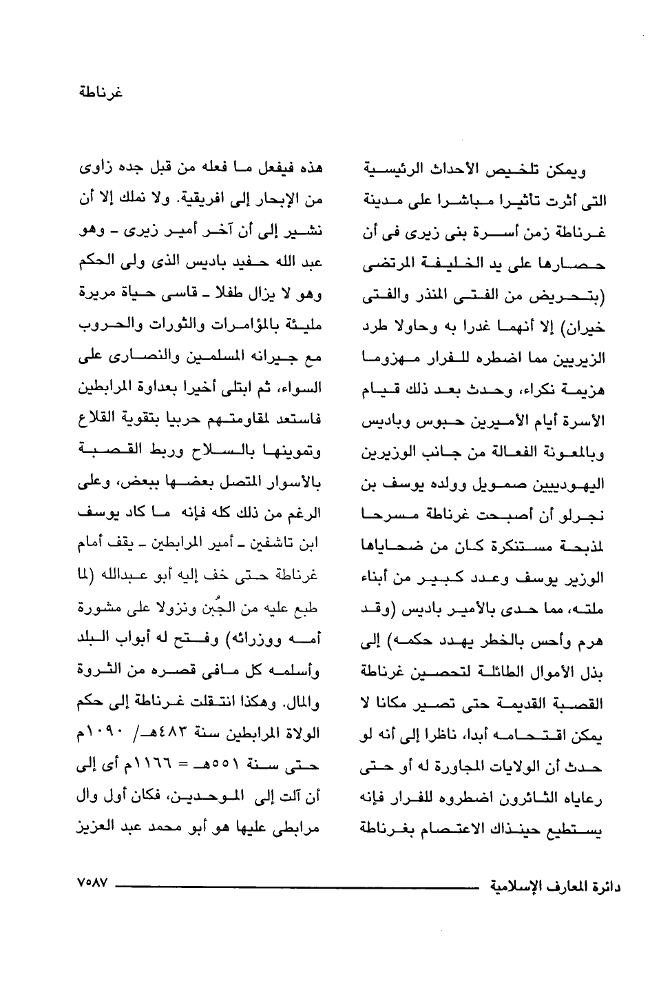 ويمكن تلخيص الأحداث الرئيسية التى أثرت تأثيرا مباشرا على مدينة غرناطة زمن أسرة بنى زيرى فى أن حصارها على يد الخليفة المرتضى (بتحريض من الفتى المنذر والفتى خيران) إلا أنهما غدرا به وحاولا طرد الزيريين مما اضطره للفرار مهزوما هزيمة نكراء، وحدث بعد ذلك قيام الأسرة أيام الأميرين حبوس وباديس وبالمعونة الفعالة من جانب الوزيرين اليهوديين صمويل وولده يوسف بن نجرلو أن أصبحت غرناطة مسرحا لمذبحة مستنكرة كان من ضحاياها الوزير يوسف وعدد كبير من أبناء ملته، مما حدى بالأمير باديس (وقد هرم وأحس بالخطر يهدد حكمه) إلى بذل الأموال الطائلة لتحصين غرناطة القصبة القديمة حتى تصير مكانا لا يمكن اقتحامه أبدا، ناظرا إلى أنه لو حدث أن الولايات المجاورة له أو حتى رعاياه الثائرون اضطروه للفرار فإنه يستطيع حينذاك الاعتصام بغرناطة هذه فيفعل ما فعله من قبل جده زاوى من الإبحار إلى افريقية. ولا نملك إلا أن نشير إلى أن آخر أمير زيرى -وهو عبد اللَّه حفيد باديس الذى ولى الحكم وهو لا يزال طفلا- قاسى حياة مريرة مليئة بالمؤامرات والثورات والحروب مع جيرانه المسلمين والنصارى على السواء، ثم ابتلى أخيرا بعداوة المرابطين فاستعد لمقاومتهم حربيا بتقوية القلاع وتموينها بالسلاح وربط القصبة بالأسوار المتصل بعضها ببعض، وعلى الرغم من ذلك كله فإنه ما كاد يوسف ابن تاشفين -أمير المرابطين- يقف أمام غرناطة حتى خف إليه أبو عبد اللَّه (لما طبع عليه من الجُبن ونزولا على مشورة أصه ووزرائه) وفتح له أبواب البلد وأسلمه كل ما فى قصره من الثروة والمال. وهكذا انتقلت غرناطة إلى حكم الولاة المرابطين سنة 483 هـ/ 1090 م حتى سنة 551 هـ = 1166 م أى إلى أن آلت إلى الموحدين، فكان أول وال مرابطى عليها هو أبو محمد عبد العزيز