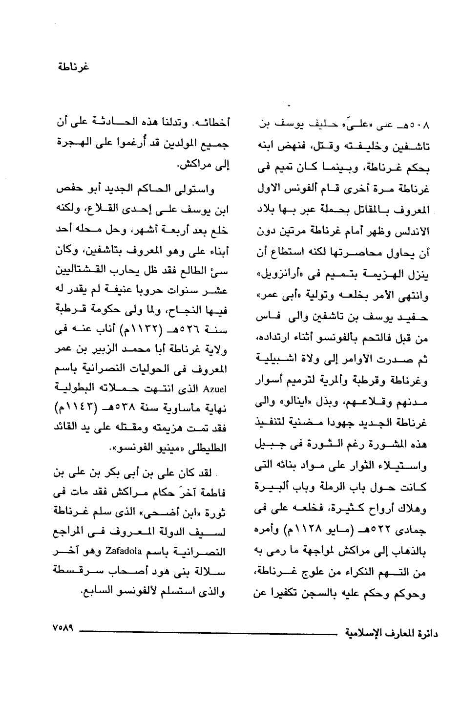 508 هـ على "علىّ" حليف يوسف بن تاشفين وخليفته وقتل، فنهض ابنه بحكم غرناطة، وبينما كان تميم فى غرناطة مرة أخرى قام ألفونس الأول المعروف بالمقاتل بحملة عبر بها بلاد الأندلس وظهر أمام غرناطة مرتين دون أن يحاول محاصرتها لكنه استطاع أن ينزل الهزيمة بتميم فى "أرانزويل" وانتهى الأمر بخلعه وتولية "أبى عمر" حفيد يوسف بن تاشفين والى فاس من قبل فالتحم بألفونسو أثناء ارتداده، ثم صدرت الأوامر إلى ولاة اشبيلية وغرناطة وقرطبة وألمرية لترميم أسوار مدنهم وقلاعهم، وبذل "اينالو" والى غرناطة الجديد جهودا مضنية لتنفيذ هذه المشورة رغم الثورة فى جبيل واستيلاء الثوار على مواد بنائه التى كانت حول باب الرملة وباب ألبيرة وهلاك أرواح كثيرة، فخلعه على فى جمادى 522 هـ (مايو 1128 م) وأمره بالذهاب إلى مراكش لمواجهة ما رمى به من التهم النكراء من علوج غرناطة، وحوكم عليه بالسجن تكفيرا عن أخطائه. وتدلنا هذه الحادثة على أن جميع المولدين قد أرغموا على الهجرة إلى مراكش.