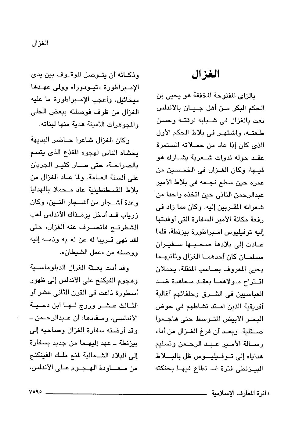 بالزاى المفتوحة المخففة هو يحيى بن الحكم البكر من أهل جيان بالأندلس نعت بالغزال فى شبابه لرقته وحسن طلعته، واشتهر فى بلاط الحكم الأول الذى كان إذا عاد من حملاته المستمرة عقد حوله ندوات شعرية يشارك هو فيها، وكان الغزال فى الخمسين من عمره حين سطع نجمه فى بلاط الأمير عبد الرحمن الثانى حين اتخذه واحدا من شعرائه المقربين إليه. وكان مما زاد فى رفعة مكانة الأمير السفارة التى أوفدتها إليه توفيليوس امبراطورة بيزنطة، فلما عادت إلى بلادها صحبها سفيران مسلمان كان أحدهما الغزال وثانيهما يحيى المعروف بصاحب المنقلة، يحملان اقتراح مولاهما بعقد معاهدة ضد العباسيين فى الشرق وحلفائهم أغالبة أفريقية الذين امتد نشاطهم فى حوض البحر الأبيض المتوسط حتى هاجموا صقلية. وبعد أن فرغ الغزال من أداء رسالة الأمير عبد الرحمن وتسليم هداياه إلى توفيليوس ظل بالبلاط البيزنطى فترة استطاع فيها بحنكته وذكائه أن يتوصل للوقوف بين يدي الإمبراطورة "تيودورا" وولى عهدها ميخائيل، وأعجب الإمبراطورة ما عليه الغزال من ظرف فوصلته ببعض الحلى والمجوهرات الثمينة هدية منها لبناته.