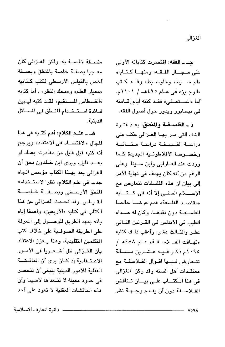 د- الفلسفة والمنطق: بعد فترة الشك التى مر بها الغزالى عكف على دراسة الفلسفة دراسة متأنية وخصوصا الأفلاطونية الجديدة كما وردت عند الفارابى وابن سينا. وعلى الرغم من أنه كان يهدف فى نهاية الأمر إلى بيان أن هذه الفلسفات تتعارض مع الإسلام السنى إلا أنه فى كتابه "مقاصد الفلسفة" قدم عرضا خالصا للفلسفة دون نقدها. وكان له صداه الطيب فى الأندلس فى القرنين الثانى عشر والثالث عشر، وأعقب ذلك كتابه "تهافت الفلاسفة" عام 488 هـ/ 1095 م ذكر فيه عشرين مسألة تتعارض فيها أقوال الفلاسفة مع معتقدات أهل السنة وقد ركز الغزالى فى هذا الكتاب على بيان تناقض الفلاسفة دون أن يقدم وجهة نظر منسقة خاصة به. ولكن الغزالى كان معجبا بصفة خاصة بالمنطق وبصفة أخص بالقياس الأرسطى فكتب كتابيه "معيار العلم" و"محك النظر"، أما كتابه "القسطاس المستقيم" فقد كتبه ليبين فائدة استخدام المنطق فى المسائل الدينية.