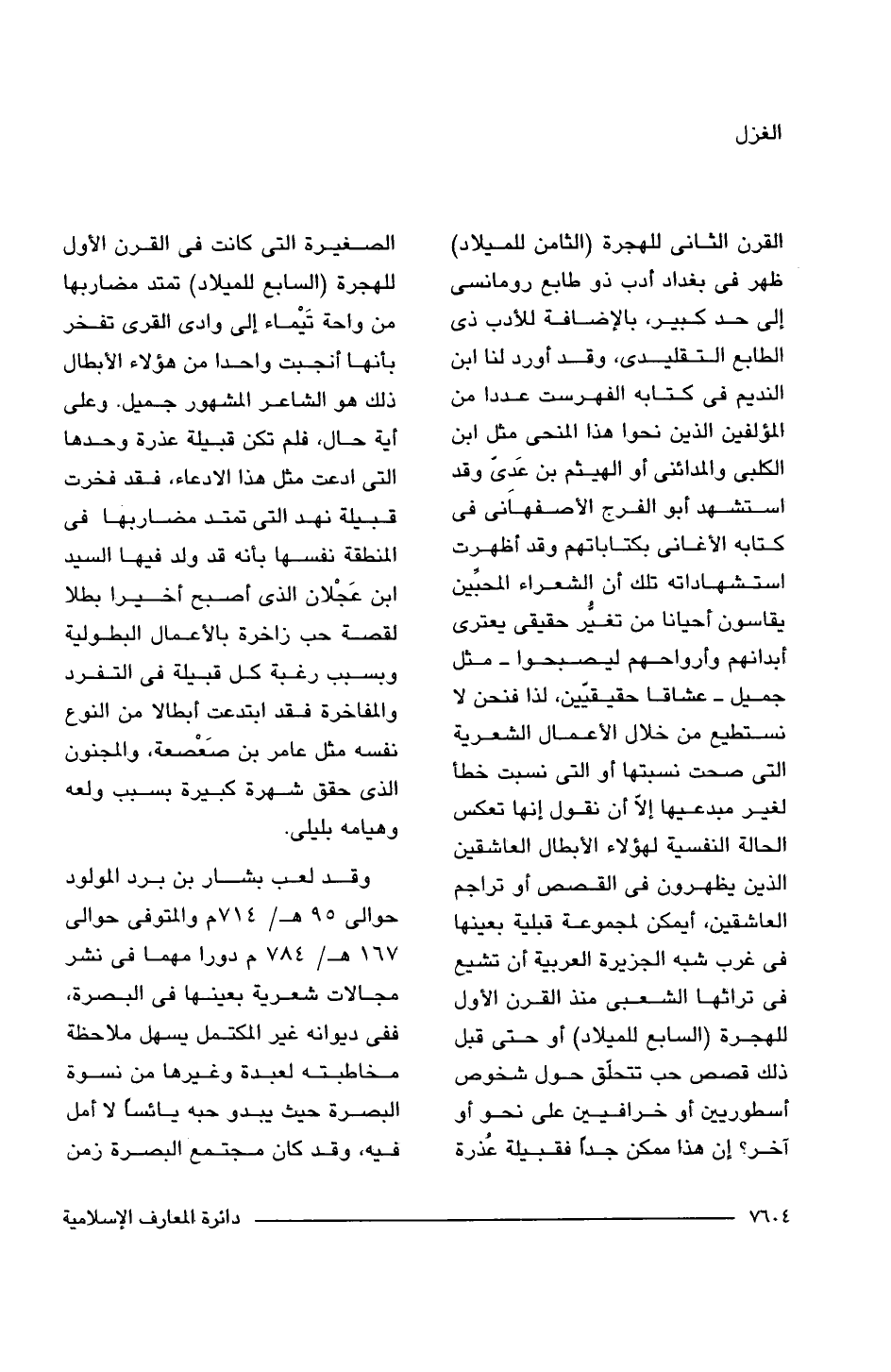 القرن الثانى للهجرة (الثامن للميلاد) ظهر فى بغداد أدب ذو طابع رومانسى إلى حد كبير، بالإضافة للأدب ذى الطابع التقليدى، وقد أورد لنا ابن النديم فى كتابه الفهرست عددا من المؤلفين الذين نحوا هذا المنحى مثل ابن الكلبى والمدائنى أو الهيثم بن عَدِىّ وقد استشهد أبو الفرج الأصفهانى فى كتابه الأغانى بكتاباتهم وقد أظهرت استشهاداته تلك أن الشعراء المحبِّين يقاسون أحيانا من تغيُّر حقيقى يعترى أبدانهم وأرواحهم ليصبحوا -مثل جميل- عشاقا حقيقيّين، لذا فنحن لا نستطيع من خلال الأعمال الشعرية التى صحت نسبتها أو التى نسبت خطأ لغير مبدعيها إلّا أن نقول إنها تعكس الحالة النفسية لهؤلاء الأبطال العاشقين الذين يظهرون فى القصص أو تراجم العاشقين، أيمكن لمجموعة قبلية بعينها فى غريب شبه الجزيرة العربية أن تشيع فى تراثها الشعبى منذ القرن الأول للهجرة (السابع للميلاد) أو حتى قبل ذلك قصص حب تتحلّق حول شخوص أسطوريين أو خرافيين على نحو أو آخر؟ إن هذا ممكن جدًا فقبيلة عُذرة الصغيرة التى كانت فى القرن الأول للهجرة (السابع للميلاد) تمتد مضاربها من واحة تَيْماء إلى وادى القرى تفخر بأنها أنجبت واحدا من هؤلاء الأبطال ذلك هو الشاعر المشهور جميل. وعلى آية، فلم تكن قبيلة عذرة وحدها التى ادعت مثل هذا الادعاء، فقد فخرت قبيلة نهد التى تمتد مضاربها فى المنطقة نفسها بأنه قد ولد فيها السيد ابن عَجْلان الذى أصبح أخيرا بطلا لقصة حب زاخرة بالأعمال البطولية وبسبب رغبة كل قبيلة فى التفرد والمفاخرة فقد ابتدعت أبطالا من النوع نفسه مثل عامر بن صَعْصعة، والمجنون الذى حقق شهرة كبيرة بسبب ولعه وهيامه بليلى.