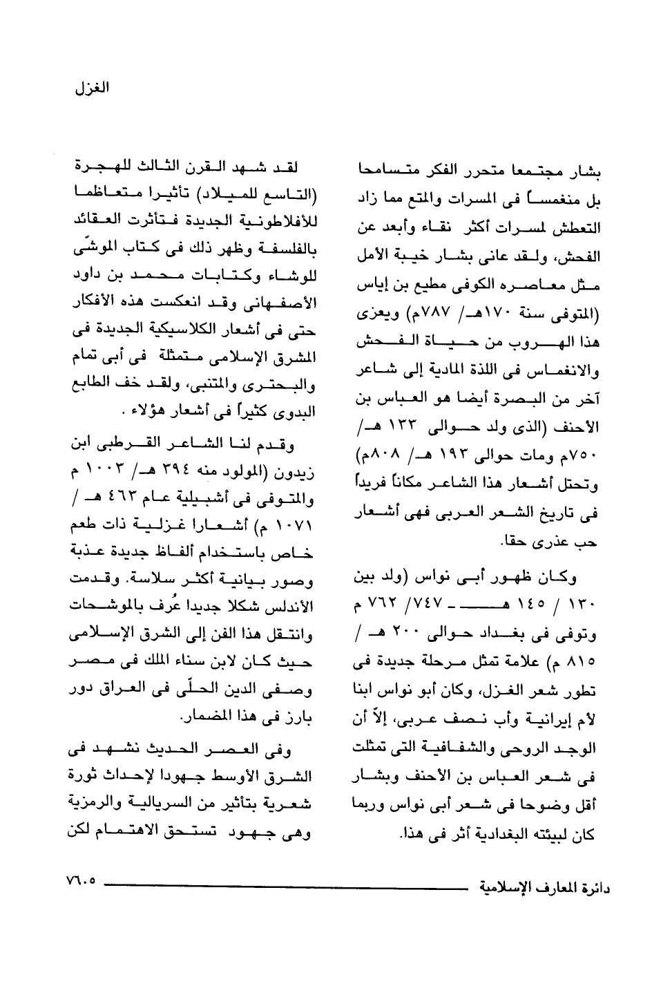 وكان ظهور أبى نواس (ولد بين 130/ 145 هـ - 747/ 762 م وتوفى فى بغداد حوالى 200 هـ/ 815 م) علامة تمثل مرحلة جديدة فى تطور شعر الغزل، وكان أبو نواس ابنا لأم إيرانية وأب نصف عربى، إلّا أن الوجد الروحى والشفافية التى تمثلت فى شعر العباس بن الأحنف وبشار أقل وضوحا فى شعر أبى نواس وربما كان لبيئته البغدادية أثر فى هذا.