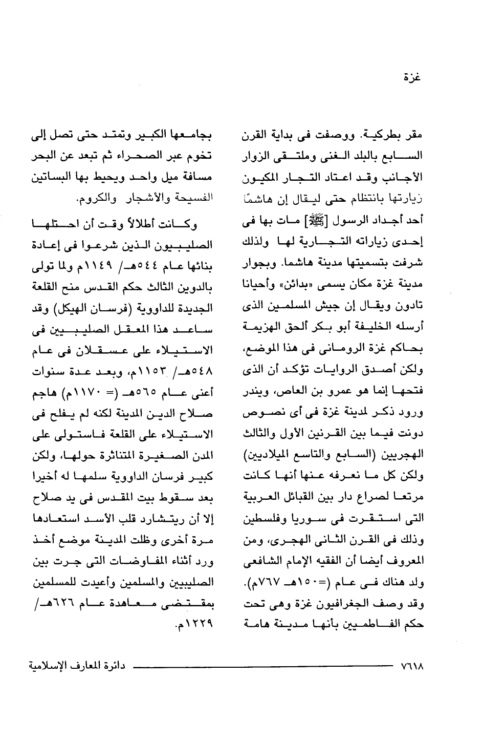 مقر بطركية. ووصفت فى بداية القرن السابع بالبلد الغنى وملتقى الزوار الأجانب وقد اعتاد التجار المكيون زيارتها بانتظام حتى ليقال إن هاشمًا أحد أجداد الرسول [-صلى اللَّه عليه وسلم-] مات بها فى إحدى زياراته التجارية لها ولذلك شرفت بتسميتها مدينة هاشما. وبجوار مدينة غزة مكان يسمى "بدائن" وأحيانا تادون ويقال إن جيش المسلمين الذى أرسله الخليفة أبو بكر ألحق الهزيمة بحاكم غزة الرومانى فى هذا الموضع، ولكن أصدق الروايات تؤكد أن الذى فتحها إنما هو عمرو بن العاص، ويندر ورود ذكر لمدينة غزة فى أى نصوص دونت فيما بين القرنين الأول والثالث الهجريين (السابع والتاسع الميلاديين) ولكن كل ما نعرفه عنها أنها كانت مرتعا لصراع دار بين القبائل العربية التى استقرت فى سوريا وفلسطين وذلك فى القرن الثانى الهجرى، ومن المعروف أيضا أن الفقيه الإمام الشافعى ولد هناك فى عام (= 150 هـ 767 م) وقد وصف الجغرافيون غزة وهى تحت حكم الفاطميين بأنها مدينة هامة بجامعها الكبير وتمتد حتى تصل إلى تخوم عبر الصحراء ثم تبعد عن البحر مسافة ميل واحد ويحيبابها البساتين الفسيحة والأشجار والكروم.