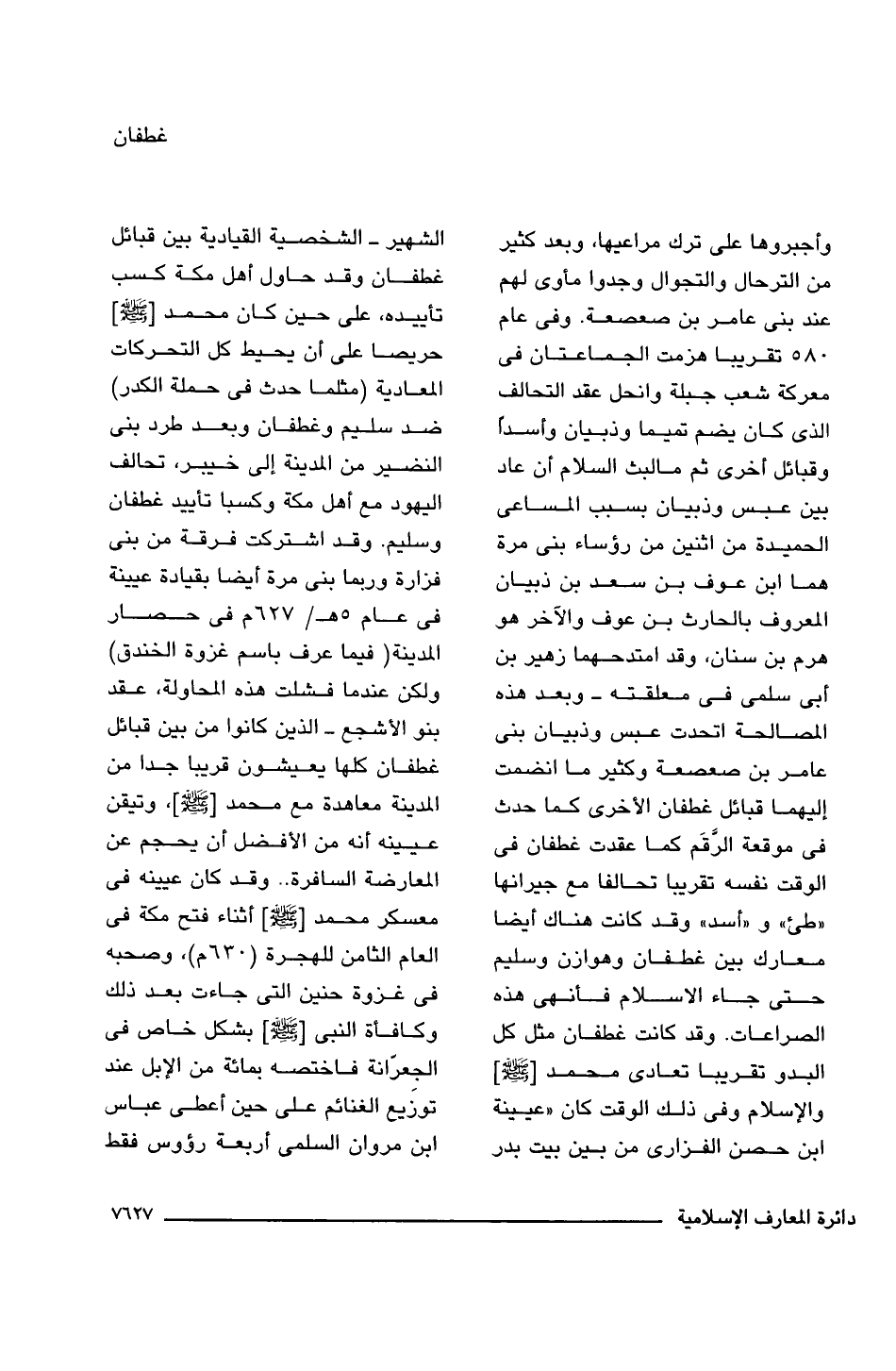وأجبروها على ترك مراعيها، وبعد كثير من الترحال والتجوال وجدوا مأوى لهم عند بنى عامر بن صعصعة. وفى عام 580 تقريبًا هزمت الجماعتان فى معركة شعب جبلة وانحل عقد التحالف الذى كان يضم نفيما وذبيان وأسدًا وقبائل أخرى ثم ما لبث السلام أن عاد بين عبس وذبيان بسبب المساعى الحميدة من اثنين من رؤساء بنى مرة هما ابن عوف بن سعد بن ذبيان المعروف بالحارث بن عوف والآخر هو هرم بن سنان، وقد امتدحهما زهير بن أبى سلمى فى معلقته -وبعد هذه المصالحة اتحدت عبس وذبيان بنى عامر بن صعصعة وكثير ما انضمت إليهما قبائل غطفان الأخرى كما حدث فى موقعة الرَّقَم كما عقدت غطفان فى الوقت نفسه تقريبًا تحالفا مع جيرانها "طئ" و"أسد" وقد كانت هناك أيضا معارك بين غطفان وهوازن وسليم حتى جاء الإسلام فأنهى هذه الصراعات. وقد كانت غطفان مثل كل البدو تقريبًا تعادى محمد [-صلى اللَّه عليه وسلم-] والإسلام وفى ذلك الوقت كان "عيينة ابن حصن الفزارى من بين بيت بدر الشهير- الشخصية القيادية بين قبائل غطفان وقد حاول أهل مكة كسب تأييده، على حين كان محمد [-صلى اللَّه عليه وسلم-] حريصا على أن يحيط كل التحركات المعادية (مثلما حدث فى حملة الكدر) ضد سليم وغطفان وبعد طرد بنى النضير من المدينة إلى خيبر، تحالف اليهود مع أهل مكة وكسبا تأييد غطفان وسليم. وقد اشتركت فرقة من بنى فزارة وربما بنى مرة أيضا بقيادة عيينة فى عام 5 هـ/ 627 م فى حصار المدينة (فيما عرف باسم غزوة الخندق) ولكن عندما فشلت هذه المحاولة، عقد بنو الأشجع -الذين كانوا من بين قبائل غطفان كلها يعيشون قريبا جدا من المدينة معاهدة مع محمد [-صلى اللَّه عليه وسلم-]، وتيقن عيينه أنه من الأفضل أن يحجم عن المعارضة السافرة. . وقد كان عيينه فى معسكر محمد [-صلى اللَّه عليه وسلم-] أثناء فتح مكة فى العام الثامن للهجرة (630 م)، وصحبه فى غزوة حنين التى جاءت بعد ذلك وكافاة النبى [-صلى اللَّه عليه وسلم-] بشكل خاص فى الجِعرّانة فاختصه بمائة من الإبل عند توزيع الغنائم على حين أعطى عباس ابن مروان السلمى أربعة رؤوس فقط