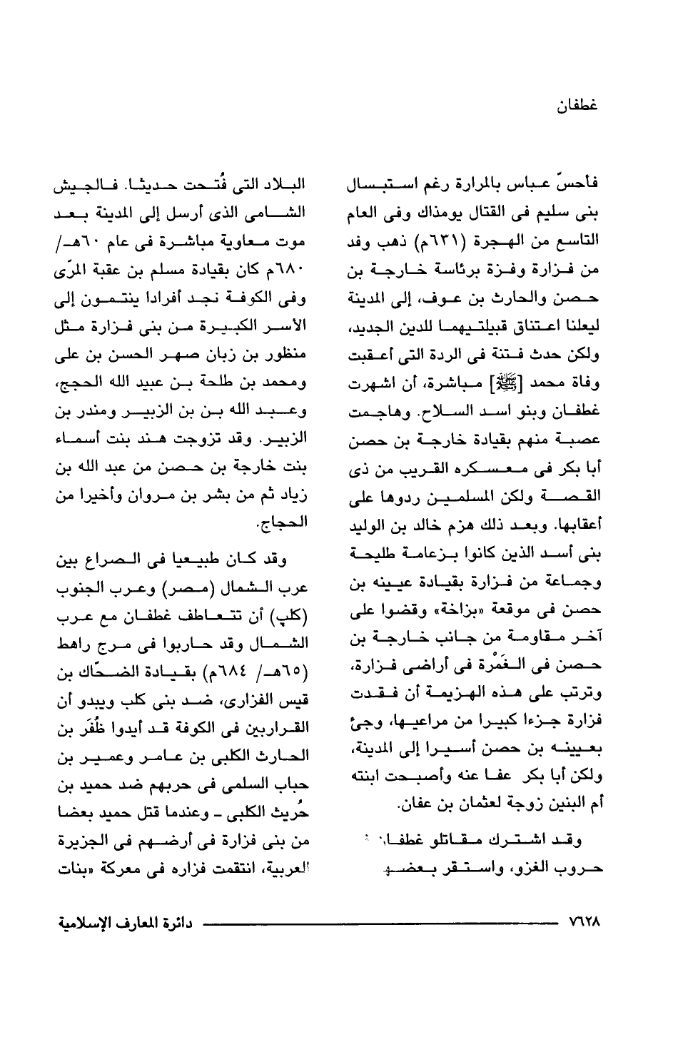 وقد اشترك مقاتلو غطفان فى حروب الغزو، واستقر بعضها فى البلاد التى فُتحت حديثا. فالجيش الشامى الذى أرسل إلى المدينة بعد موت معاوية مباشرة فى عام 60 هـ/ 680 م كان بقيادة مسلم بن عقبة المرّى وفى الكوفة نجد أفرادا ينتمون إلى الأسر الكب يرة من بنى فزارة مثل منظور بن زبان صهر الحسن بن على ومحمد بن طلحة بن عبيد اللَّه الحجج، وعبد اللَّه بن بن الزبير ومندر بن الزبير. وقد تزوجت هند بنت أسماء بنت خارجة بن حصن من عبد اللَّه بن زياد ثم من بشر بن مروان وأخيرا من الحجاج.