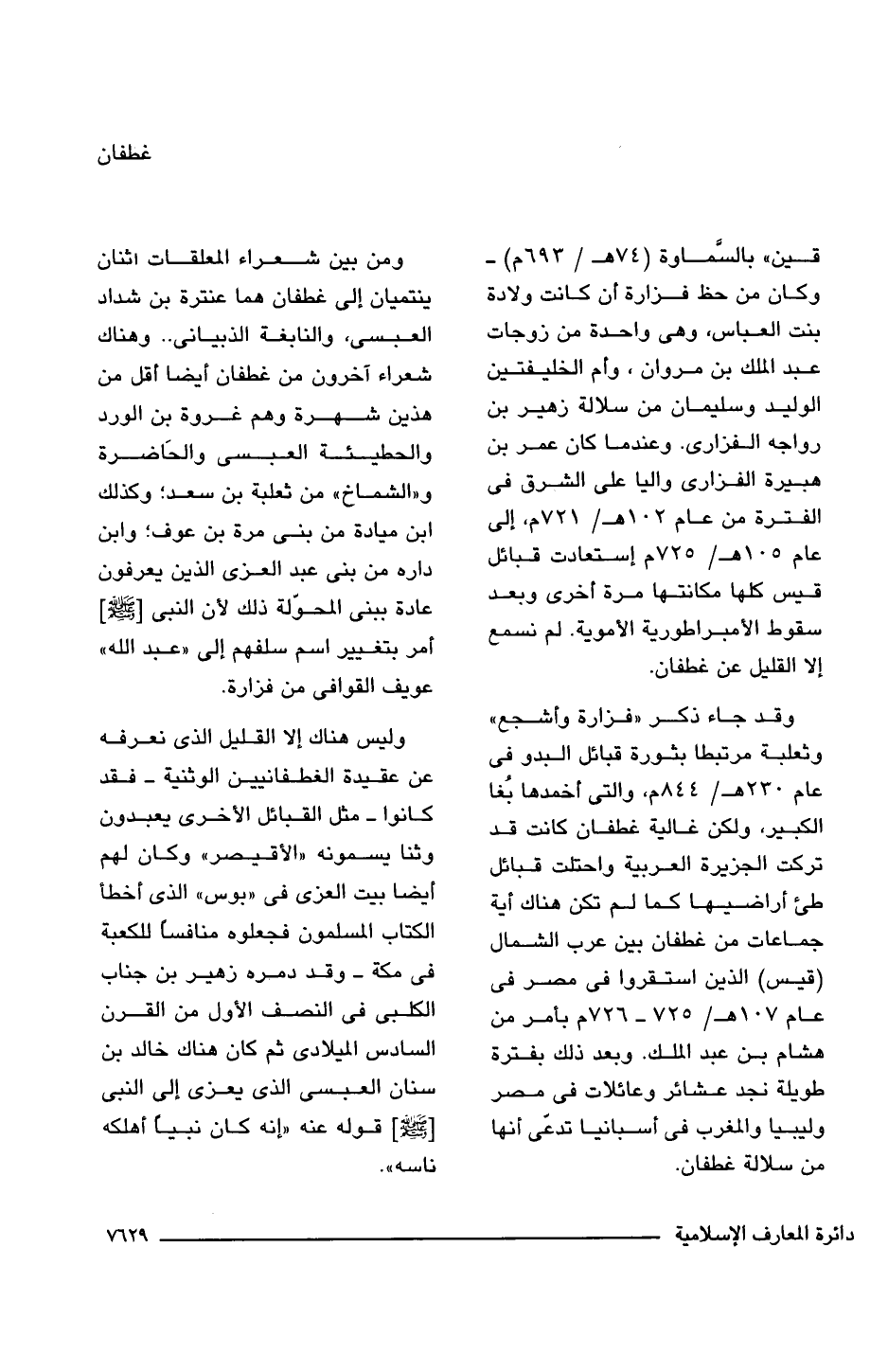 قين" بالسَّماوة) (74 هـ/ 693 م) - وكان من حظ فزارة أن كانت ولادة بنت العباس، وهى واحدة من زوجات عبد الملك بن مروان، وأم الخليفتين الوليد وسليمان من سلالة زهير بن رواجه الفزارى. وعندما كان عمر بن هبيرة الفزارى واليا على الشرق فى الفترة من عام 102 هـ/ 721 م، إلى عام 105 هـ/ 725 م إستعادت قبائل قيس كلها مكانتها مرة أخرى وبعد سقوط الأمبراطورية الأموية. لم نسمع إلا القليل عن غطفان.