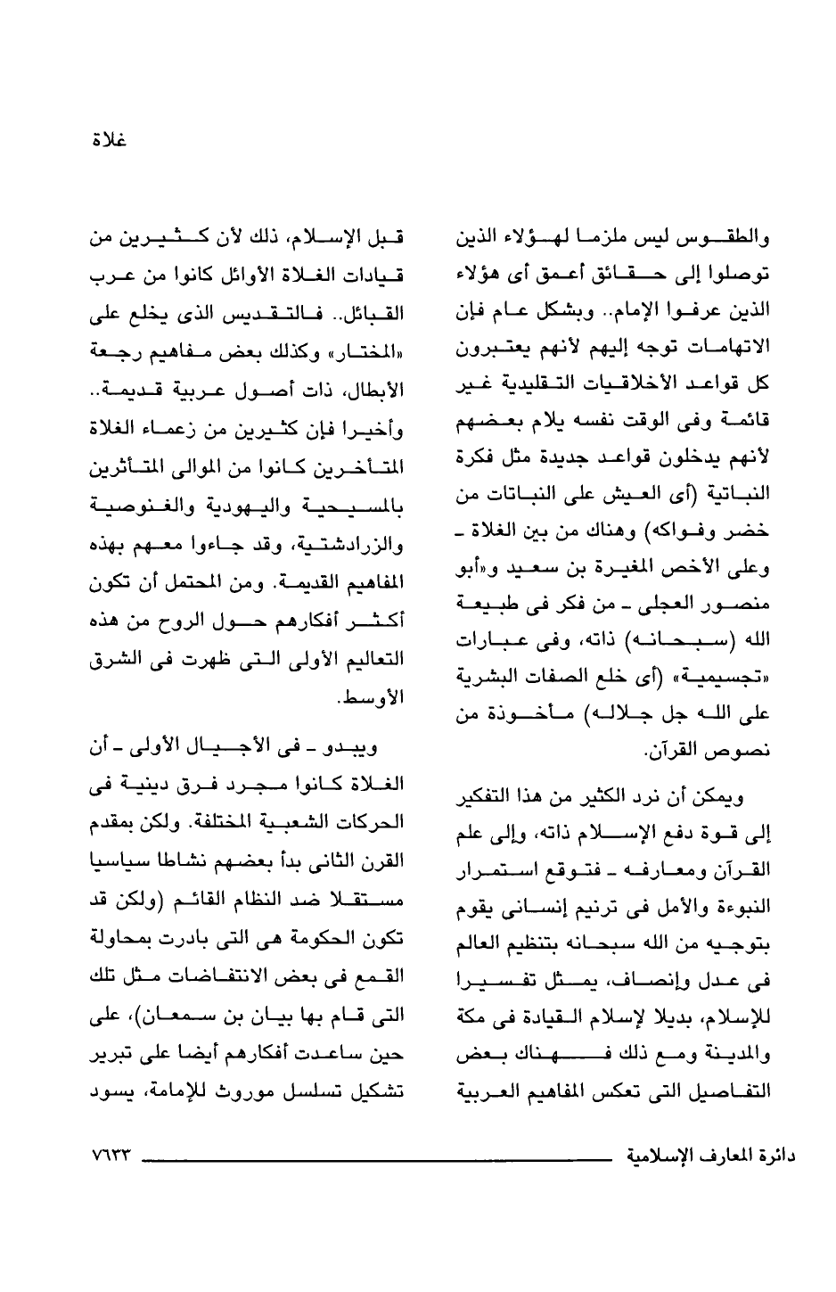 ويمكن أن نرد الكثير من هذا التفكير إلى قوة دفع الإسلام ذاته، وإلى علم القرآن ومعارفه -فتوقع استمرار النبوءة والأمل فى ترنيم إنسانى يقوم بتوجيه من اللَّه سبحانه بتنظيم العالم فى عدل وإنصاف، يمثل تفسيرا للإسلام، بديلا لإسلام القيادة فى مكة والمدينة ومع ذلك فهناك بعض التفاصيل التى تعكس المفاهيم العربية قبل الإسلام، ذلك لأن كثيرين من قيادات الغلاة الأوائل كانوا من عرب القبائل. . فالتقديس الذى يخلع على "المختار" وكذلك بعض مفاهيم رجعة الأبطال، ذات أصول عربية قديمة. . وأخيرا فإن كثيرين من زعماء الغلاة المتأخرين كانوا من الموالى المتأثرين بالمسيحية واليهودية والغنوصية والزرادشتية، وقد جاءوا معهم بهذه المفاهيم القديمة. ومن المحتمل أن تكون أكثر أفكارهم حول الروح من هذه التعاليم الأولى التى ظهرت فى الشرق الأوسط.