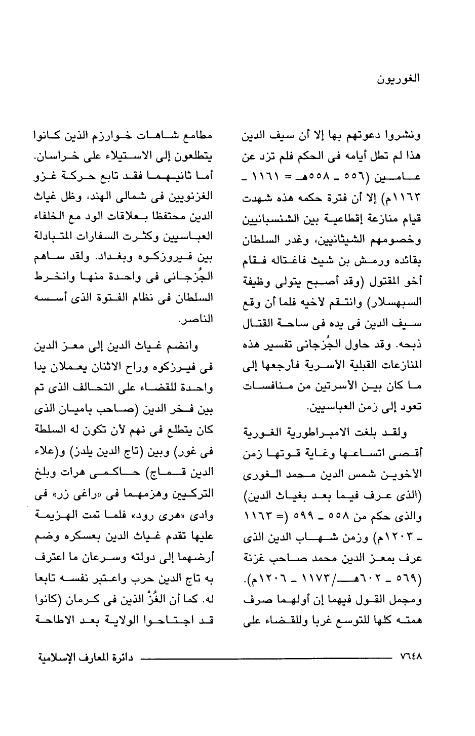 ولقد بلغت الامبراطورية الغورية أقصى اتساعها وغاية قوتها زمن الأخوين شمس الدين محمد الغورى (الذى عرف فيما بعد بغياث الدين) والذى حكم من 558 - 599 (= 1163 - 1203 م) وزمن شهاب الدين الذى عرف بمعز الدين محمد صاحب غزنة (569 - 602 هـ/ 1173 - 1206 م). ومجمل القول فيهما إن أولهما صرف همته كلها للتوسع غربا وللقضاء على مطامع شاهات خوارزم الذين كانوا يتطلعون إلى الاستيلاء على خراسان. أما ثانيهما فقد تابع حركة غزو الغزنويين فى شمالى الهند، وظل غياث الدين محتفظا بعلاقات الود مع الخلفاء العباسيين وكثرت السفارات المتبادلة بين فيروزكوه وبغداد. ولقد ساهم الجُزجانى فى واحدة منها وانخرط السلطان فى نظام الفتوة الذى أسسه الناصر.