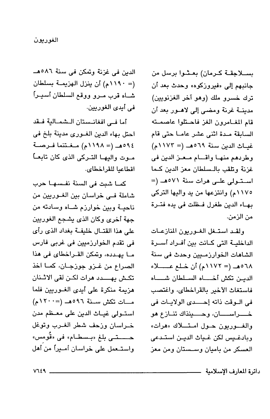بسلاجقة كرمان) بعثوا برسل من جانبهم إلى "فيروزكوه" وحدث بعد أن ترك خسرو ملك (وهو آخر الغزنويين) مدينة غرنة ومضى إلى لاهور بعد أن قام المغامرون الغز فاحتلوا عاصمته السابقة مدة اثنى عشر عاما حتى قام غياث الدين سنة 569 هـ (= 1173 م) وطردهم منها واقام معز الدين فى غزنة وتلقب بالسلطان معز الدين كما استولى على هرات سنة 571 هـ (= 1175 م) وانتزعها من يد واليها التركى بهاء الدين طغرل فظلت فى يده فترة من الزمن.