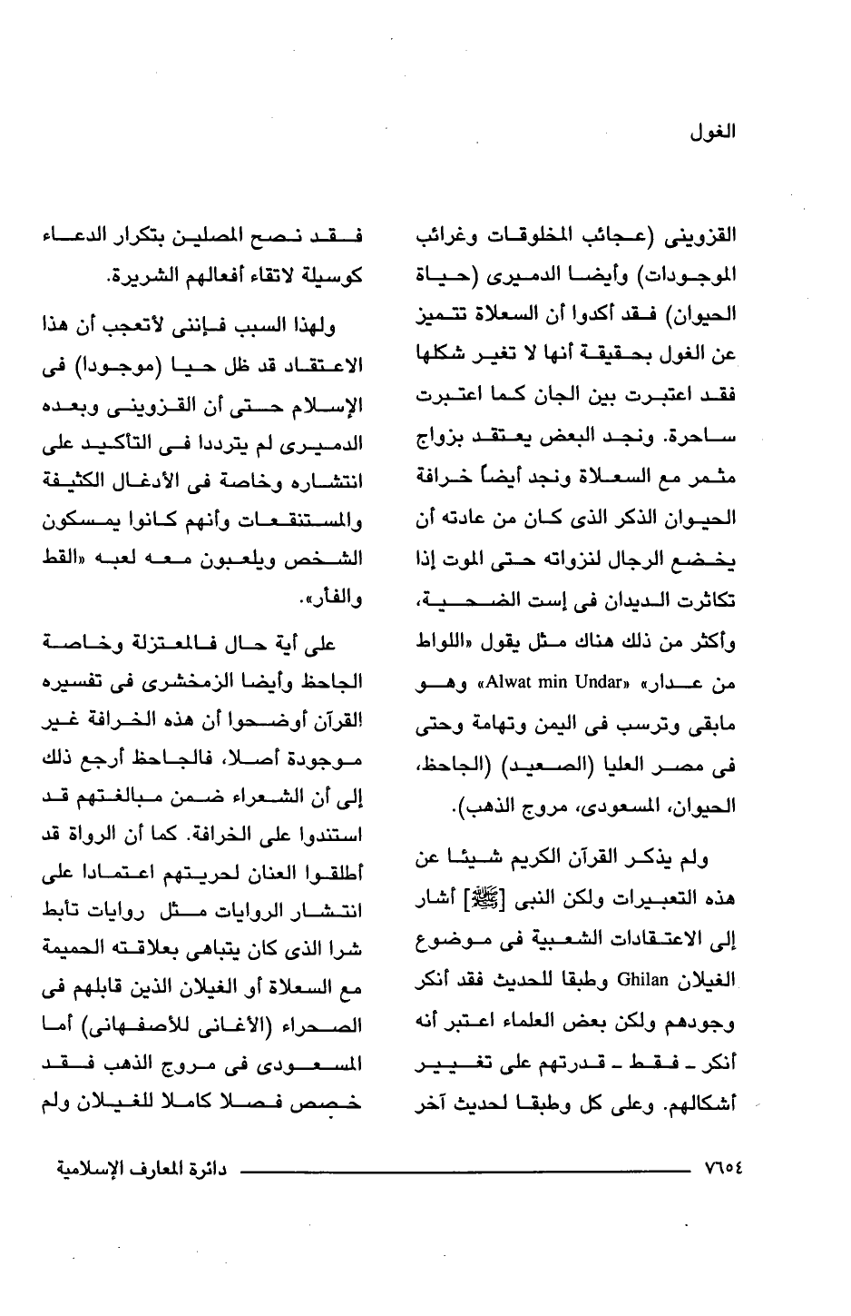 ولهذا السبب فإننى لأتعجب أن هذا الاعتقاد قد ظل حيا (موجودا) فى الإسلام حتى أن القزوينى وبعده الدميرى لم يترددا فى التأكيد على انتشاره وخاصة فى الأدغال الكثيفة والمستنقعات وأنهم كانوا يمسكون الشخص ويلعبون معه لعبه "القط والفأر".