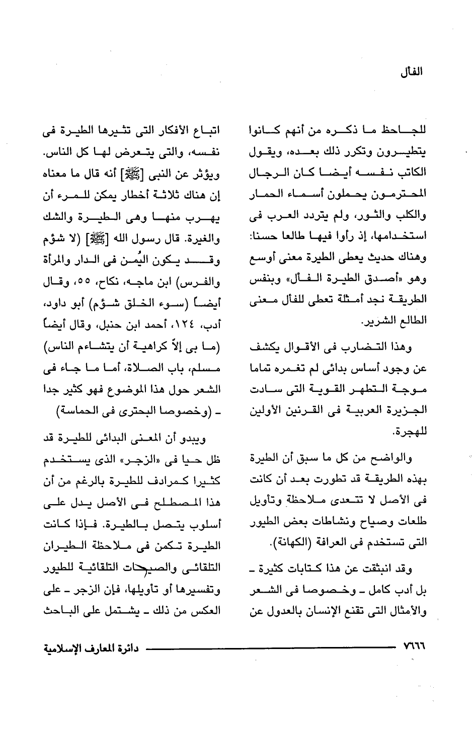 وقد انبثقت عن هذا كتابات كثيرة -بل أدب كامل- وخصوصا فى الشعر والأمثال التى تقنع الإنسان بالعدول عن اتباع الأفكار التى تثيرها الطيرة فى نفسه، والتى يتعرض لها كل الناس. ويؤثر عن النبى [-صلى اللَّه عليه وسلم-] أنه قال ما معناه إن هناك ثلاثة أخطار يمكن للمرء أن يهرب منها وهى الطيرة والشك والغيرة. قال رسول اللَّه [-صلى اللَّه عليه وسلم-] (لا شؤم وقد يكون اليُمن فى الدار والمرأة والفرس) ابن ماجه، نكاح، 55، وقال أيضًا (سوء الخلق شؤم) أبو داود، أدب، 124، أحمد ابن حنبل، وقال أيضًا (ما بى إلّا كراهية أن يتشاءم الناس) مسلم، باب الصلاة، أما ما جاء فى الشعر حول هذا الموضوع فهو كثير جدا - (وخصوصا البحترى فى الحماسة).