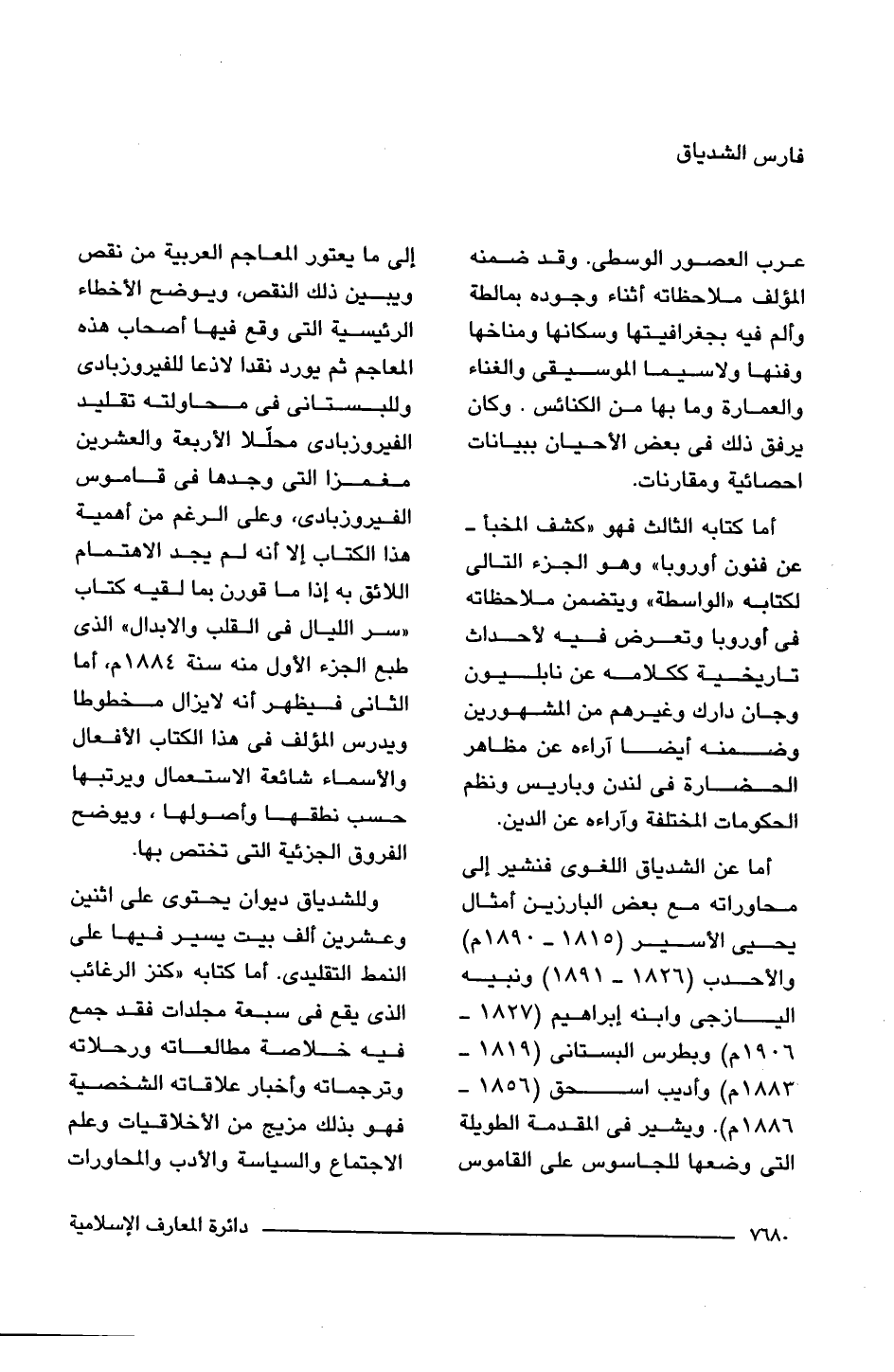أما عن الشدياق اللغوى فنشير إلى محاوراته مع بعض البارزين أمثال يحيى الأسير (1815 - 1890 م) والأحدب (1826 - 1891) ونبيه اليازجى وابنه إبراهيم (1827 - 1906 م) وبطرس البستانى (1819 - 1883 م) وأديب اسحق (1856 - 1886 م). ويشير فى المقدمة الطويلة التى وضعها للجاسوس على القاموس إلى ما يعتور المعاجم العربية من نقص ويبين ذلك النقص، ويوضح الأخطاء الرئيسية التى وقع فيها أصحاب هذه المعاجم ثم يورد نقدا لاذعا للفيروزبادى وللبستانى فى محاولته تقليد الفيروزبادى محلّلا الأربعة والعشرين مغمزا التى وجدها فى قاموس الفيروزبادى، وعلى الرغم من أهمية هذا الكتاب إلا أنه لم يجد الاهتمام اللائق به إذا ما قورن بما لقيه كتاب "سر الليال فى القلب والابدال" الذى طبع الجزء الأول منه سنة 1884 م، أما الثانى فيظهر أنه لا يزال مخطوطا ويدرس المؤلف فى هذا الكتاب الأفعال والأسماء شائعة الاستعمال ويرتبها حسب نطقها وأصولها، ويوضح الفروق الجزئية التى تختص بها.