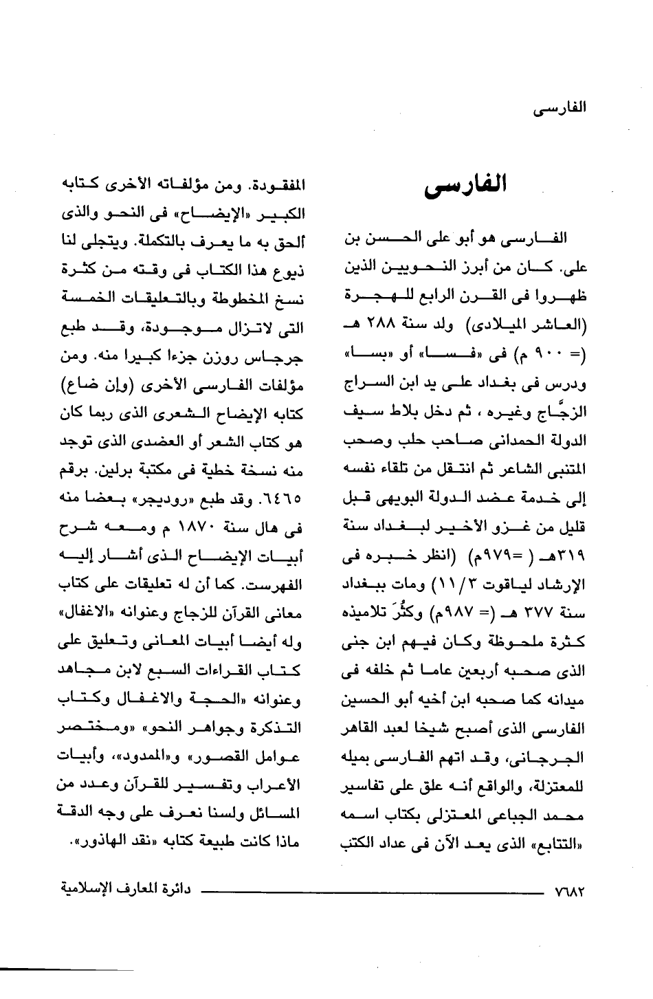 الفارسى هو أبو على الحسن بن على. كان من أبرز النحويين الذين ظهروا فى القرن الرابع للهجرة (العاشر الميلادى) ولد سنة 288 هـ (= 900 م) فى "فسا" أو "بسا" ودرس فى بغداد على يد ابن السراج الزجَّاج وغيره، ثم دخل بلاط سيف الدولة الحمدانى صاحب حلب وصحب المتنبى الشاعر ثم انتقل من تلقاء نفسه إلى خدمة عضد الدولة البويهى قبل قليل من غزو الأخير لبغداد سنة 319 هـ (= 979 م) (انظر خبره فى الإرشاد لياقوت 3/ 11) ومات ببغداد سنة 377 هـ (= 987 م) وكثُرَ تلاميذه كثرة ملحوظة وكان فيهم ابن جنى الذى صحبه أربعين عاما ثم خلفه فى ميدانه كما صحبه ابن أخيه أبو الحسين الفارسى الذى أصبح شيخا لعبد القاهر الجرجانى، وقد اتهم الفارسى بميله للمعتزلة، والواقع أنه علق على تفاسير محمد الجباعى المعتزلى بكتاب اسمه "التتابع" الذى يعد الآن فى عداد الكتب المفقودة. ومن مؤلفاته الأخرى كتابه الكبير "الإيضاح" فى النحو والذى ألحق به ما يعرف بالتكملة. ويتجلى لنا ذيوع هذا الكتاب فى وقته من كثرة نسخ المخطوطة وبالتعليقات الخمسة التى لا تزال موجودة، وقد طبع جرجاس روزن جزءا كبيرا منه. ومن مؤلفات الفارسى الأخرى (وإن ضاع) كتابه الإيضاح الشعرى الذى ربما كان هو كتاب الشعر أو العضدى الذى توجد منه نسخة خطية فى مكتبة برلين. برقم 6465. وقد طبع "روديجر" بعضا منه فى هال سنة 1870 م ومعه شرح أبيات الإيضاح الذى أشار إليه الفهرست. كما أن له تعليقات على كتاب معانى القرآن للزجاج وعنوانه "الاغفال" وله أيضا أبيات المعانى وتعليق على كتاب القراءات السبع لابن مجاهد وعنوانه "الحجة والاغفال وكتاب التذكرة وجواهر النحو" و"مختصر عوامل القصور" و"الممدود"، وأبيات الأعراب وتفسير للقرآن وعدد من المسائل ولسنا نعرف على وجه الدقة ماذا كانت طبيعة كتابه "نقد الهاذور".