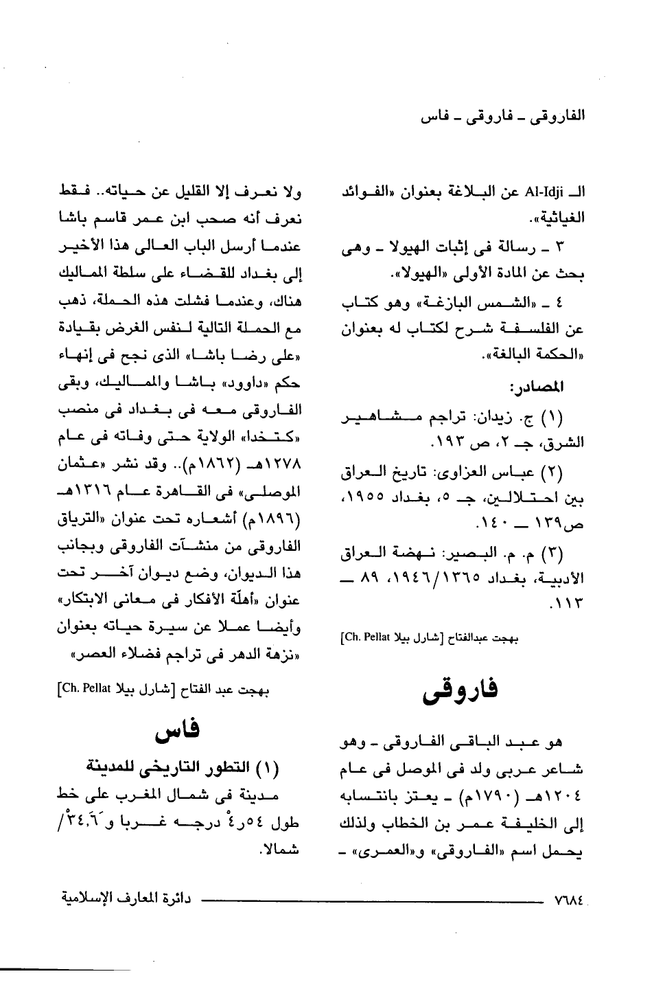 هو عبد الباقى الفاروقى -وهو شاعر عربى ولد فى الموصل فى عام 1204 هـ (1790 م) - يعتز بانتسابه إلى الخليفة عمر بن الخطاب ولذلك يحمل اسم "الفاروقى" و"العمرى" ولا نعرف إلا القليل عن حياته. . فقط نعرف أنه صحب ابن عمر قاسم باشا عندما أرسل الباب العالى هذا الأخير إلى بغداد للقضاء على سلطة المماليك هناك، وعندما فشلت هذه الحملة، ذهب مع الحملة التالية لنفس الغرض بقيادة "على رضا باشا" الذى نجح فى إنهاء حكم "داوود" باشا والمماليك، وبقى الفاروقى معه فى بغداد فى منصب "كتخدا" الولاية حتى وفاته فى عام 1278 هـ (1862 م). . وقد نشر "عثمان الموصلى" فى القاهرة عام 1316 هـ (1896 م) أشعاره تحت عنوان "الترياق الفاروقى من منشآت الفاروقى وبجانب هذا الديوان، وضع ديوان آخر تحت عنوان "أهلّة الأفكار فى معانى الابتكار" وأيضا عملا عن سيرة حياته بعنوان "نزهة الدهر فى تراجم فضلاء العصر"