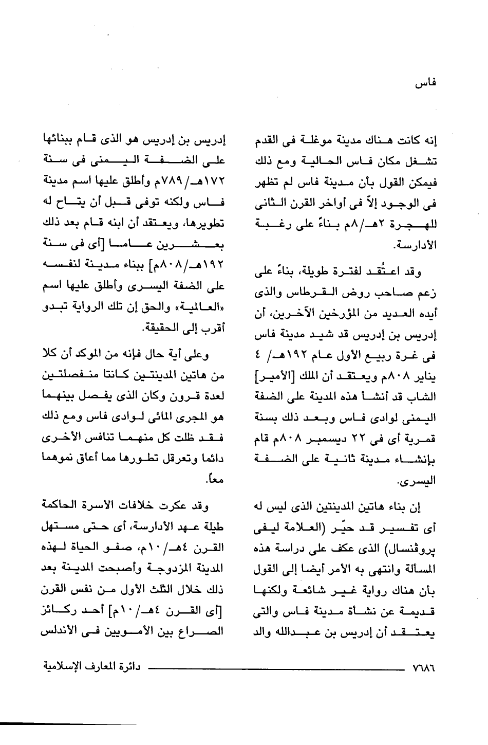 إن بناء هاتين المدينتين الذى ليس له أى تفسير قد حيّر (العلامة ليفى بروفنسال) الذى عكف على دراسة هذه المسألة وانتهى به الأمر أيضا إلى القول بأن هناك رواية غير شائعة ولكنها قديمة عن نشأة مدينة فاس والتى يعتقد أن إدريس بن عبد اللَّه والد إدريس بن إدريس هو الذى قام ببنائها على الضفة اليمنى فى سنة 172 هـ/ 789 م وأطلق عليها اسم مدينة فاس ولكنه توفى قبل أن يتاح له تطويرها، ويعتقد أن ابنه قام بعد ذلك بعشرين عاما [أى فى سنة 192 هـ/ 808 م] ببناء مدينة لنفسه على الضفة اليسرى وأطلق عليها اسم "العالمية" والحق إن تلك الرواية تبدو أقرب إلى الحقيقة.