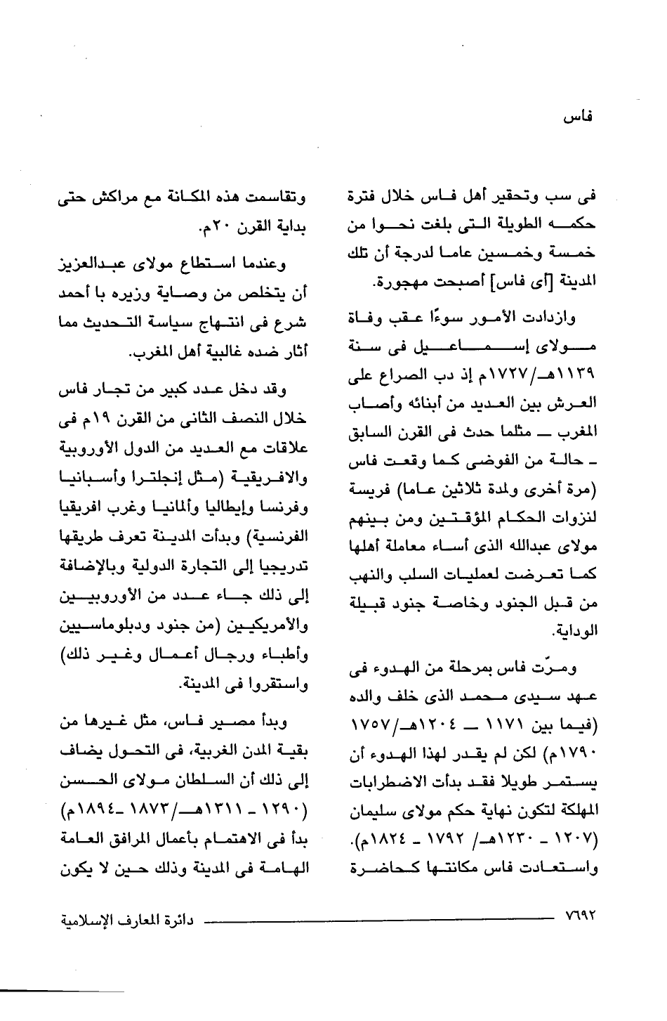 ومرّت فاس بمرحلة من الهدوء فى عهد سيدى محمد الذى خلف والده (فيما بين 1171 - 1204 هـ/ 1757 - 1790 م) لكن لم يقدر لهذا الهدوء أن يستمر طويلا فقد بدأت الاضطرابات المهلكة لتكون نهاية حكم مولاى سليمان (1207 - 1230 هـ/ 1792 - 1824 م). واستعادت فاس مكانتها كحاضرة وتقاسمت هذه المكانة مع مراكش حتى بداية القرن 20 م.