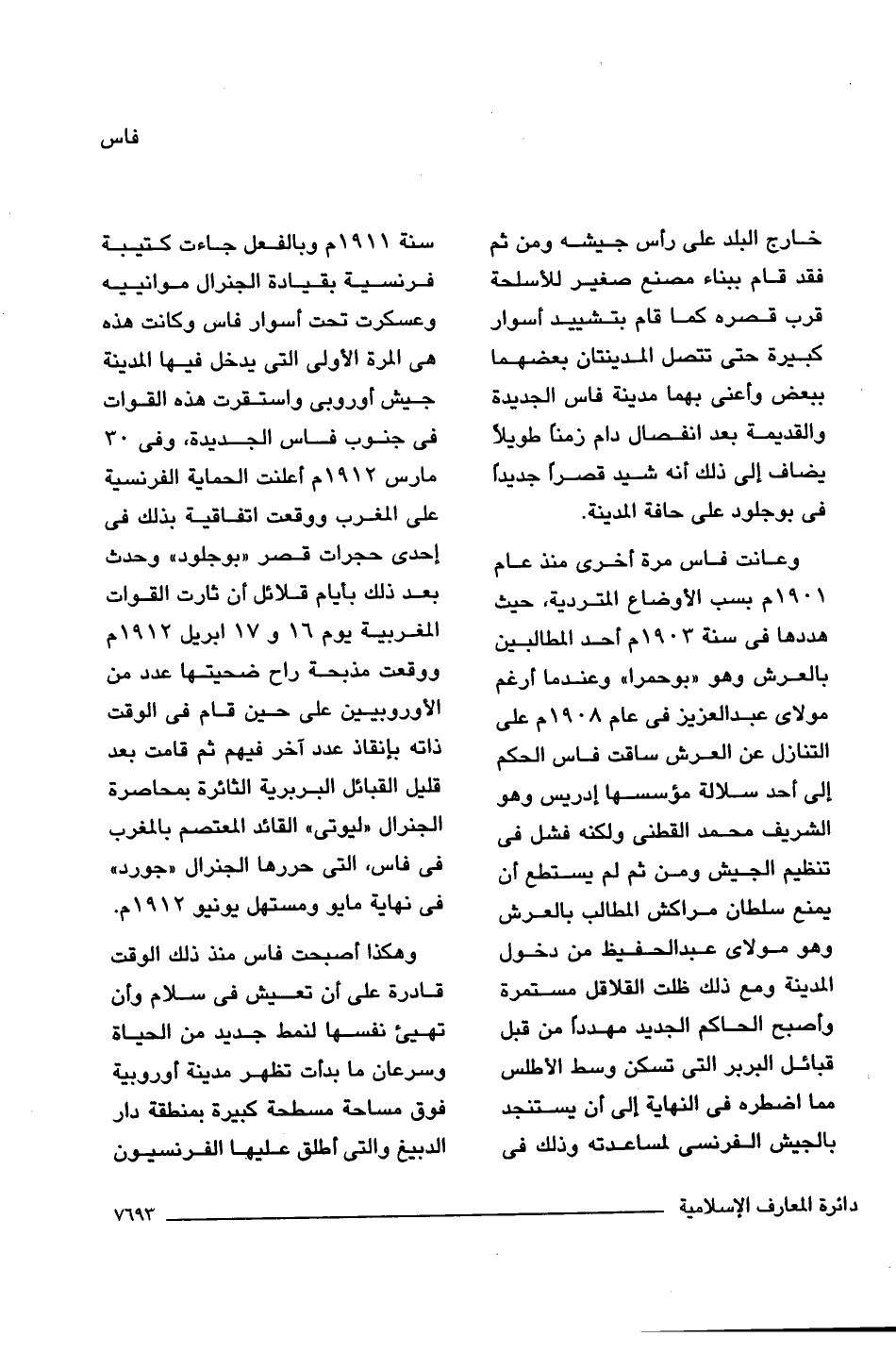 وهكذا أصبحت فاس منذ ذلك الوقت قادرة على أن تعيش فى سلام وأن تهيئ نفسها لنمط جديد من الحياة وسرعان ما بدأت تظهر مدينة أوروبية فوق مساحة مسطحة كبيرة بمنطقة دار الدبيغ والتى أطلق عليها الفرنسيون