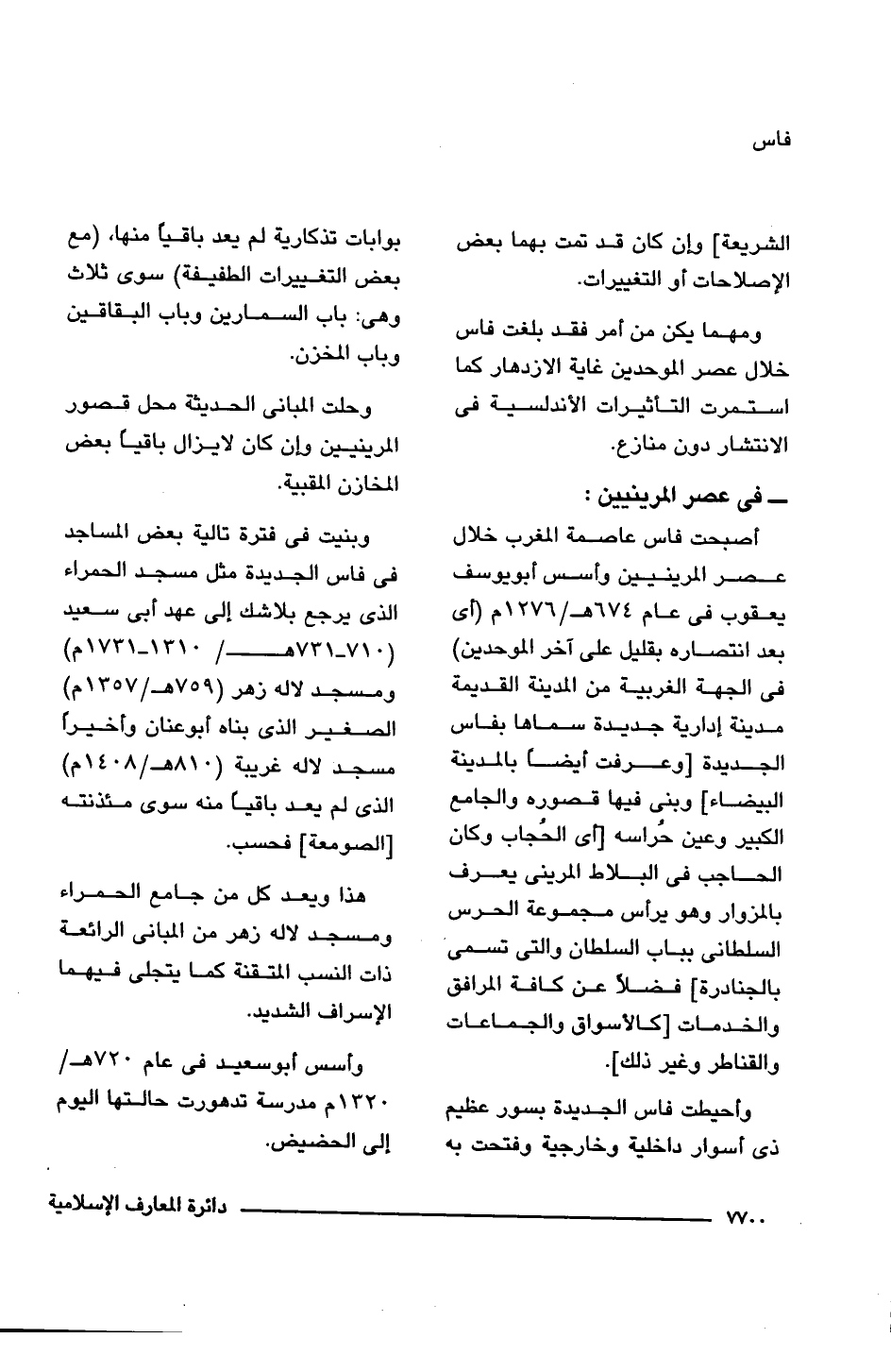 وبنيت فى فترة تالية بعض المساجد فى فاس الجديدة مثل مسجد الحمراء الذى يرجع بلا شك إلى عهد أبى سعيد (710 - 731 هـ/ 1310 - 1731 م) ومسجد لاله زهر (759 هـ/ 1357 م) الصغير الذى بناه أبو عنان وأخيرًا مسجد لاله غريبة (810 هـ/ 1408 م) الذى لم يعد باقيًا منه سوى مئذنته [الصومعة] فحسب.