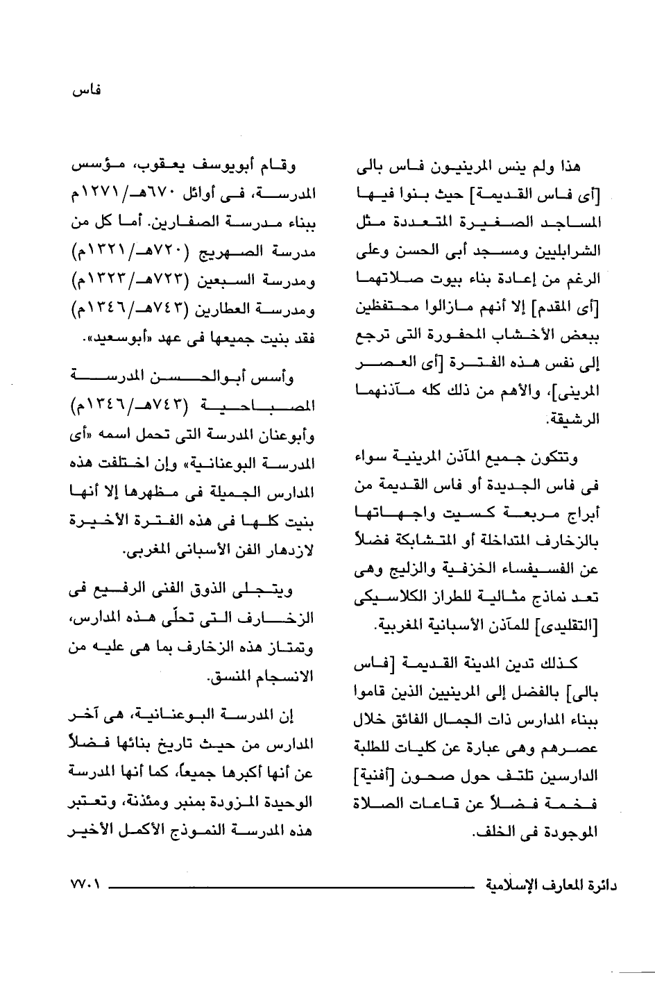 وأسس أبو الحسن المدرسة المصباحية (743 هـ/ 1346 م) وأبو عنان المدرسة التى تحمل اسمه "أى المدرسة البوعنانية" وإن اختلفت هذه المدارس الجميلة فى مظهرها إلا أنها بنيت كلها فى هذه الفترة الأخيرة لازدهار الفن الأسبانى المغربى.