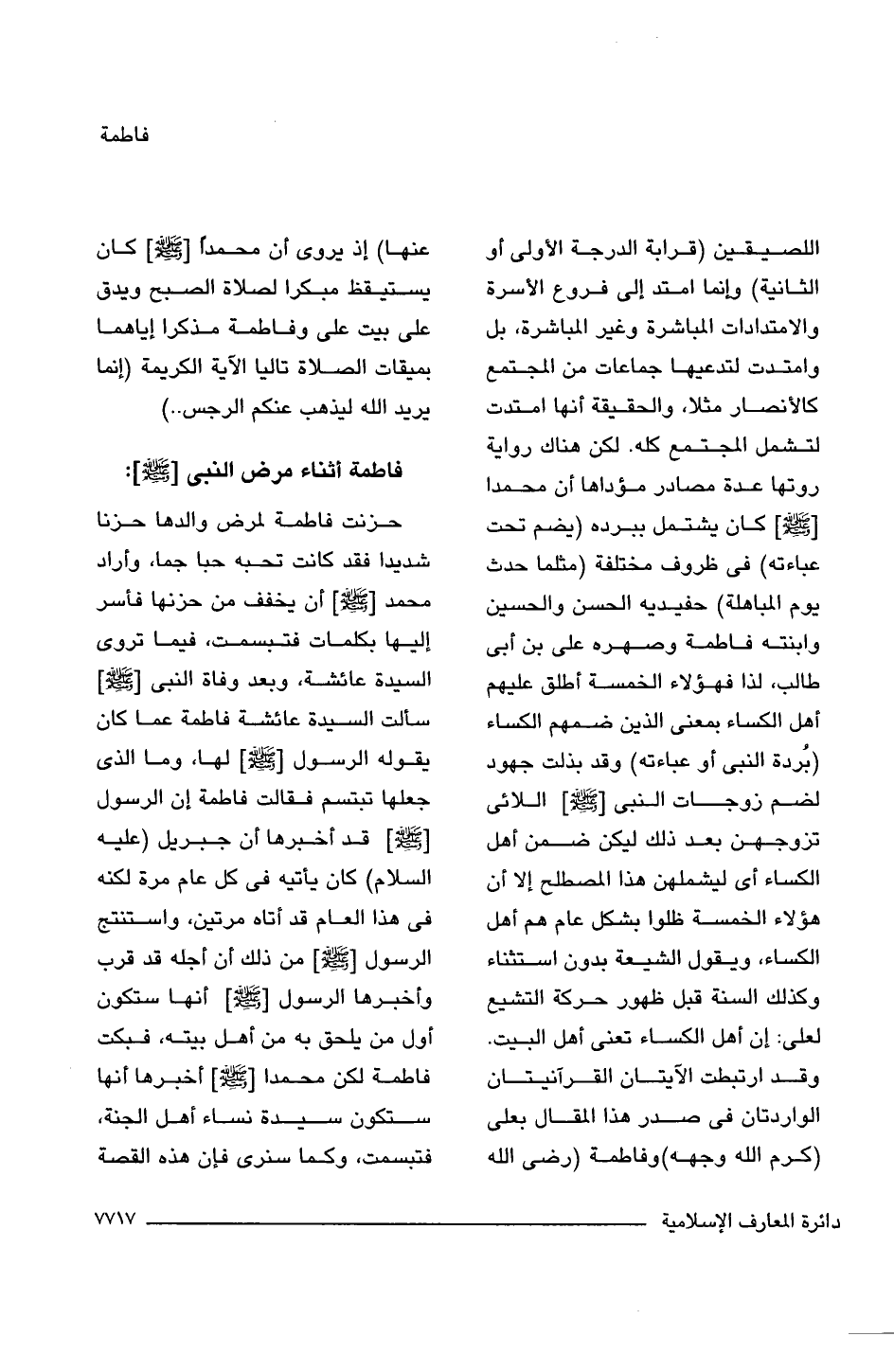اللصيقين (قرابة الدرجة الأولى أو الثانية) وإنما امتد إلى فروع الأسرة والامتدادات المباشرة وغير المباشرة، بل وامتدت لتدعيها جماعات من المجتمع كالأنصار مثلا، والحقيقة أنها امتدت لتشمل المجتمع كله. لكن هناك رواية روتها عدة مصادر مؤداها أن محمدا -صلى اللَّه عليه وسلم- كان يشتمل ببرده (يضم تحت عباءته) فى ظروف مختلفة (مثلما حدث يوم المباهلة) حفيديه الحسن والحسين وابنته فاطمة وصهره على بن أبى طالب، لذا فهؤلاء الخمسة أطلق عليهم أهل الكساء بمعنى الذين ضمهم الكساء (بُردة النبى أو عباءته) وقد بذلت جهود لضم زوجات النبى [-صلى اللَّه عليه وسلم-] اللائى تزوجهن بعد ذلك ليكن ضمن أهل الكساء أى ليشملهن هذا المصطلح إلا أن هؤلاء الخمسة ظلوا بشكل عام هم أهل الكساء، ويقول الشيعة بدون استثناء وكذلك السنة قبل ظهور حركة التشيع لعلى: إن أهل الكساء تعنى أهل البيت. وقد ارتبطت الآيتان القرآنيتان الواردتان فى صدر هذا المقال بعلى (كرم اللَّه وجهه) وفاطمة (رضى اللَّه عنها) إذ يروى أن محمدًا [-صلى اللَّه عليه وسلم-] كان يستيقظ مبكرا لصلاة الصبح ويدق على بيت على وفاطمة مذكرا إياهما بميقات الصلاة تاليا الآية الكريمة {إِنَّمَا يُرِيدُ اللَّهُ لِيُذْهِبَ عَنْكُمُ الرِّجْسَ. .}