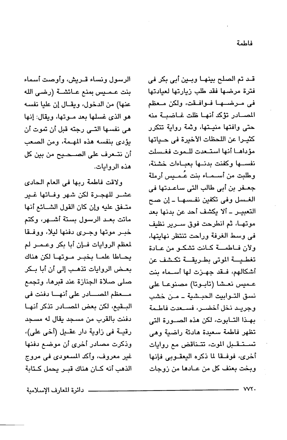 قد تم الصلح بينها وبين أبى بكر فى فترة مرضها فقد طلب زيارتها لعيادتها فى مرضها فوافقت، ولكن معظم المصادر تؤكد أنها ظلت غاضبة منه حتى وافتها منيتها، وثمة رواية تتكرر كثيرا عن اللحظات الأخيرة فى حياتها مؤداها أنها استعدت للموت فغسلت نفسها وكفنت بدنها بعباءات خشنة، وطلبت من أسماء بنت عُميس أرملة جعفر بن أبى طالب التى ساعدتها فى الغسل وفى تكفين نفسها -إن صح التعبير- ألا يكشف أحد عن بدنها بعد موتها، ثم انطرحت فوق سرير نظيف فى وسط الغرفة وراحت تنتظر نهايتها، ولأن فاطمة كانت تشكو من عادة تغطية الموتى بطريقة تكشف عن أشكالهم، فقد جهزت لها أسماء بنت عميس نعشا (تابوتا) مصنوعا على نسق التوابيت الحبشية -من خشب وجريد نخل أخضر، فسعدت فاطمة بهذا التابوت، لكن هذه الصورة التى تظهر فاطمة سعيدة هادئة راضية وهى تستقبل الموت، تتناقض مع روايات أخرى، فوفقا لما ذكره اليعقوبى فإنها وبخت بعنف كل من عادها من زوجات الرسول ونساء قريش، وأوصت أسماء بنت عميس بمنع عائشة (رضى اللَّه عنها) من الدخول، ويقال إن عليا نفسه هو الذى غسلها بعد موتها، ويقال: إنها هى نفسها التى رجته قبل أن تموت أن يؤدى بنفسه هذه المهمة، ومن الصعب أن نتعرف على الصحيح من بين كل هذه الروايات.
