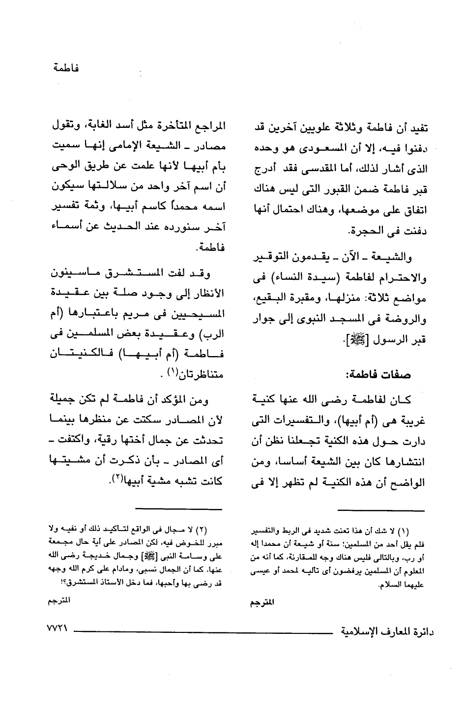 (¬2) لا مجال فى الواقع لتأكيد ذلك أو نفيه ولا مبرر للخوض فيه، لكن المصادر على أية حال مجمعة على وسامة النبى [-صلى اللَّه عليه وسلم-] وجمال خديجة (رضى اللَّه عنها)، كما أن الجمال نسبى، وما دام على كرم اللَّه وجهه قد رضى بها وأحبها، فما دخل الأستاذ المستشرق؟ ! المترجم