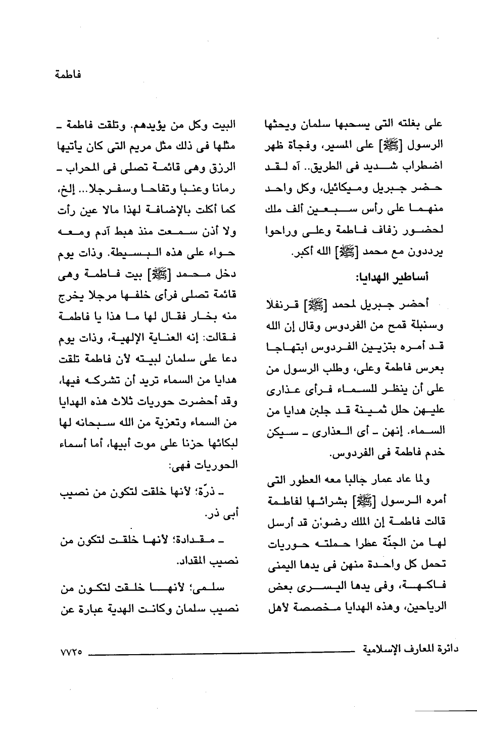 ولما عاد عمار جالبا معه العطور التى أمره الرسول [-صلى اللَّه عليه وسلم-] بشرائها لفاطمة قالت فاطمة إن الملك رضوان قد أرسل لها من الجنّة عطرا حملته حوريات تحمل كل واحدة منهن فى يدها اليمنى فاكهة، وفى يدها اليسرى بعض الرياحين، وهذه الهدايا مخصصة لأهل البيت وكل من يؤيدهم. وتلقت فاطمة -مثلها فى ذلك مثل مريم التى كان يأتيها الرزق وهى قائمة تصلى فى المحراب- رمانا وعنبا وتفاحا وسفرجلا. . . إلخ، كما أكلت بالإضافة لهذا مالا عين رأت ولا أذن سمعت منذ هبط آدم ومعه حواء على هذه البسيطة. وذات يوم دخل محمد [-صلى اللَّه عليه وسلم-] بيت فاطمة وهى قائمة تصلى فرأى خلفها مرجلا يخرج منه بخار فقال لها ما هذا يا فاطمة فقالت: إنه العناية الإلهية، وذات يوم دعا على سلمان لبيته لأن فاطمة تلقت هدايا من السماء تريد أن تشركه فيها، وقد أحضرت حوريات ثلاث هذه الهدايا من السماء وتعزية من اللَّه سبحانه لها لبكائها حزنا على موت أبيها، أما أسماء الحوريات فهى: