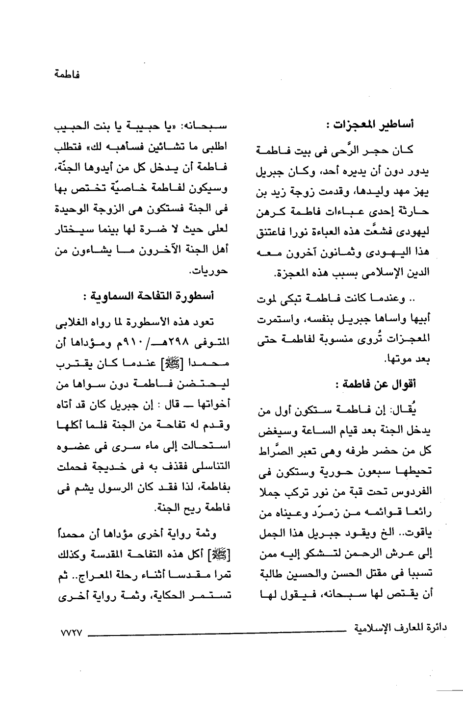 . . وعندما كانت فاطمة تبكى لموت أبيها واساها جبريل بنفسه، واستمرت المعجزات تُروى منسوبة لفاطمة حتى بعد موتها.