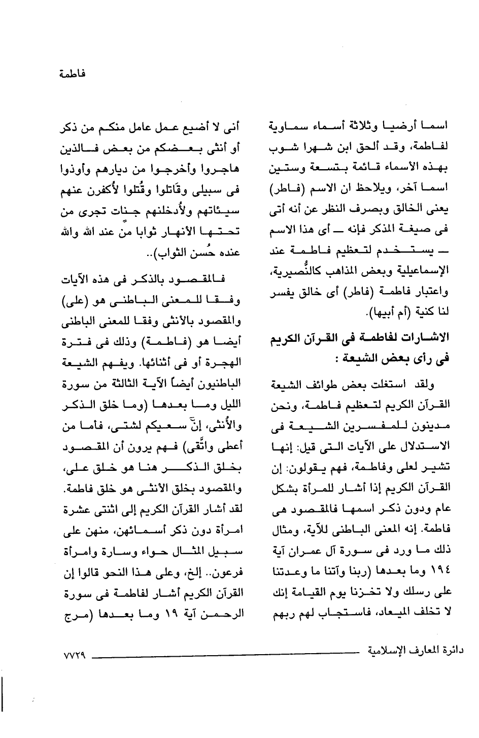 ولقد استغلت بعض طوائف الشيعة القرآن الكريم لتعظيم فاطمة، ونحن مدينون للمفسرين الشيعة فى الاستدلال على الآيات التى قيل: إنها تشير لعلى وفاطمة، فهم يقولون: إن القرآن الكريم إذا أشار للمرأة بشكل عام ودون ذكر اسمها فالمقصود هى فاطمة. إنه المعنى الباطنى للآية، ومثال ذلك ما ورد فى سورة آل عمران آية 194 وما بعدها {رَبَّنَا وَآتِنَا مَا وَعَدْتَنَا عَلَى رُسُلِكَ وَلَا تُخْزِنَا يَوْمَ الْقِيَامَةِ إِنَّكَ لَا تُخْلِفُ الْمِيعَادَ (194) فَاسْتَجَابَ لَهُمْ رَبُّهُمْ أَنِّي لَا أُضِيعُ عَمَلَ عَامِلٍ مِنْكُمْ مِنْ ذَكَرٍ أَوْ أُنْثَى بَعْضُكُمْ مِنْ بَعْضٍ فَالَّذِينَ هَاجَرُوا وَأُخْرِجُوا مِنْ دِيَارِهِمْ وَأُوذُوا فِي سَبِيلِي وَقَاتَلُوا وَقُتِلُوا لَأُكَفِّرَنَّ عَنْهُمْ سَيِّئَاتِهِمْ وَلَأُدْخِلَنَّهُمْ جَنَّاتٍ تَجْرِي مِنْ تَحْتِهَا الْأَنْهَارُ ثَوَابًا مِنْ عِنْدِ اللَّهِ وَاللَّهُ عِنْدَهُ حُسْنُ الثَّوَابِ}. .
