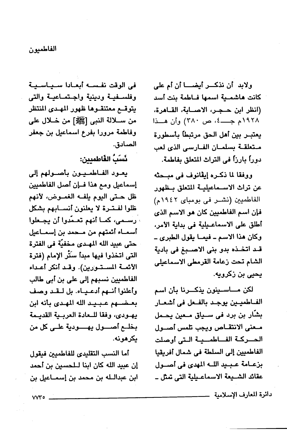 لكن ماسينون يذكرنا بأن اسم الفاطميين يوجد بالفعل فى أشعار بشّار بن برد فى سياق معين يحمل معنى الانتقاص ويجب تلمس أصول الحركة الفاطمية التى أوصلت الفاطميين إلى السلطة فى شمال أفريقيا بزعامة عبيد اللَّه المهدى فى أصول عقائد الشيعة الاسماعيلية التى تمثل -فى الوقت نفسه أبعادا سياسية وفلسفية ودينية واجتماعية والتى يتوقع معتنقوها ظهور المهدى المنتظر من سلالة النبى [-صلى اللَّه عليه وسلم-] من خلال على وفاطمة مرورا بفرع إسماعيل بن جعفر الصادق.