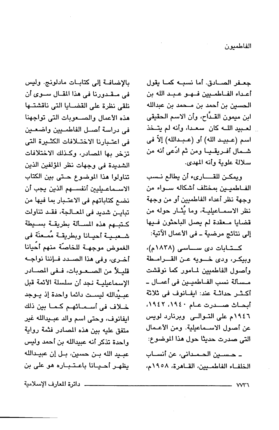 - حسين الحمدانى، عن أنساب الخلفاء الفاطميين، القاهرة، 1958 م، بالإضافة إلى كتابات مادلونج. وليس فى مقدورنا فى هذا المقال سوى أن نلقى نظرة على القضايا التى ناقشتها هذه الأعمال والصعوبات التى تواجهنا فى دراسة أصل الفاطميين واضعين فى اعتبارنا الاختلافات الكثيرة التى تزخر بها المصادر، وكذلك الاختلافات الشديدة فى وجهات نظر المؤلفين الذين تناولوا هذا الموضوع حتى بين الكتاب الاسماعيليين أنفسهم الذين يجب أن نضع كتاباتهم فى الاعتبار بما فيها من تباين شديد فى المعالجة، فقد تناولت كتبهم هذه المسألة بطريقة بسيطة شعبية أحيانا وبطريقة مُمعنَة فى الغموض موجهة للخاصة منهم أحيانا أخرى، وفى هذا الصدد فإننا نواجه قليلًا من الصعوبات، ففى المصادر الإسماعيلية نجد أن سلسلة الأئمة قبل عبيْد اللَّه ليست دائما واحدة إذ يوجد خلاف فى أسمائهم كما بين ذلك ايفانوف، وحتى اسم والد عبيد اللَّه غير متفق عليه بين هذه المصادر فثمة رواية واحدة تذكر أنه عبيد اللَّه بن أحمد وليس عبيد اللَّه بن حسين، بل إن عبيد اللَّه يظهر أحيانا باعتباره هو على بن