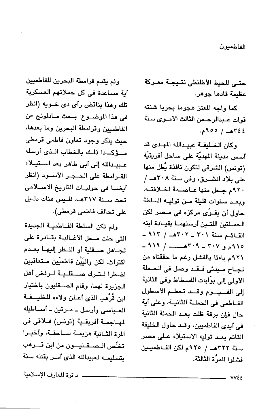 وكان الخليفة عبيد اللَّه المهدى قد أسس مدينة المهديّة على ساحل أفريقيّة (تونس) الشرقى لتكون نافذة يُطل منها بلاد المشرق، وفى سنة 308 هـ/ 930 م جعل منها عاصمة لخلافته. وبعد سنوات قليلة من توليه السلطة حاول أن يقوّى مركزه فى مصر لكن الحملتين اللتين أرسلهمما بقيادة ابنه القائم سنة 301 - 302 هـ/ 913 - 915 م و 307 - 309 هـ/ 919 - 921 م باءتا بالفشل رغم ما حققتاه من نجاح مبدئى فقد وصل فى الحملة الأولى إلى بوّابات الفسطاط وفى الثانية إلى الفيوم وقد تحطم الأسطول الفاطمى فى الحملة الثانية، وعلى أية حال فإن برقة ظلت بعد الحملة الثانية فى أيدى الفاطميين، وقد حاول الخليفة القائم بعد توليه الاستيلاء على مصر سنة 323 هـ/ 925 م لكن الفاطميين فشلوا للمرَّة الثالثة.