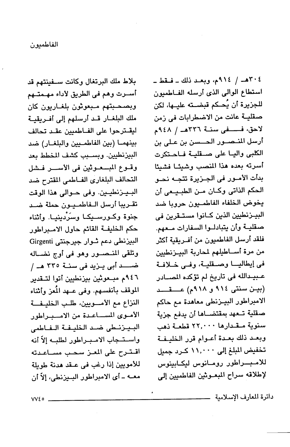 304 هـ/ 914 م، وبعد ذلك -فقط- استطاع الوالى الذى أرسله الفاطميون للجزيرة أن يُحكم قبضته عليها، لكن صقلية عانت من الاضطرابات فى زمن لاحق، ففى سنة 336 هـ/ 948 م أرسل المنصور الحسن بن على بن الكلبى واليا على صقلية فاحتكرت أسرته بعده هذا المنصب وشيئا فشيئا بدأت الأمور فى الجزيرة تتجه نحو الحكم الذاتى وكان من الطبيعى أن يخوض الخلفاء الفاطميون حروبا ضد البيزنطيين الذين كانوا مستقرين فى صقلية وأن يتبادلوا السفارات معهم. فلقد أرسل الفاطميون من أفريقية أكثر من مرة أساطيلهم لمحاربة البيزنطيين فى إيطاليا وصقلية، وفى خلافة عبيد اللَّه فى تاريخ لم تؤكده المصادر (بين سنتى 914 و 918 م) عقد الإمبراطور البيزنطى معاهدة مع حاكم صقلية تعهد بمقتضاها أن يدفع جزية سنوية مقدارها 22.000 قطعة ذهب وبعد ذلك بعدة أعوام قرر الخليفة تخفيض المبلغ إلى 11.000 كرد جميل للامبراطور رومانوس ليكابينوس لإطلاقه سراح المبعوثين الفاطميين إلى بلاط ملك البرتغال وكانت سفينتهم قد أسرت وهم فى الطريق لأداء مهمتهم وبصحبتهم مبعوثون بلغاريون كان ملك البلغار قد أرسلهم إلى أفريقية ليقترحوا على الفاطميين عقد تحالف بينهما (بين الفاطميين والبلغار) ضد البيزنطيين. وبسبب كشف المخطط بعد وقوع المبعوثين فى الأسر فشل التحالف البلغارى الفاطمى المقترح ضد البيزنطيين. وفى حوالى هذا الوقت تقريبًا أرسل الفاطميون حملة ضد جنوة وكورسيكا وسَرْدينيا. وأثناء حكم الخليفة القائم حاول الإمبراطور البيزنطى دعم ثوار جيرجنتى Girgenti وتلقى المنصور وهو فى أوج نضاله ضد أبى يزيد فى سنة 335 هـ/ 946 م مبعوثين بيزنطيين أتوا لتقدير الموقف بأنفسهم. وفى عهد المُعز وأثناء النزاع مع الأمويين، طلب الخليفة الأموى المساعدة من الإمبراطور البيزنطى ضد الخليفة الفاطمى واستجاب الإمبراطور لطلبه إلّا أنه اقترح على المعز سحب مساعدته للأمويين إذا رغب فى عقد هدنة طويلة معه -أى الإمبراطور البيزنطى، إلا أن