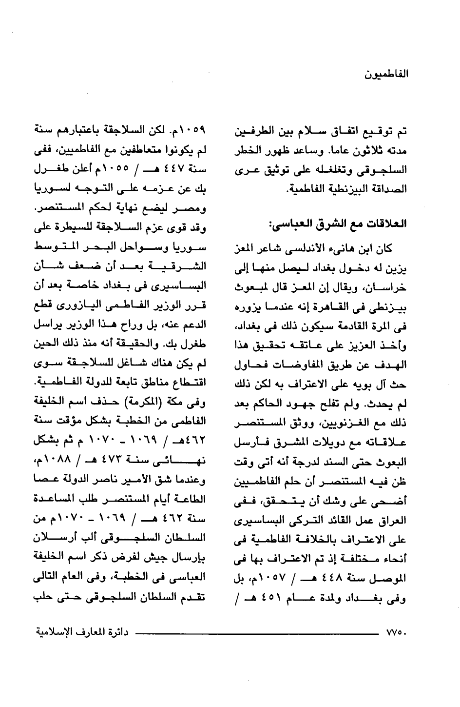 كان ابن هانئ الأندلسى شاعر المعز يزين له دخول بغداد ليصل منها إلى خراسان، ويقال إن المعز قال لمبعوث بيزنطى فى القاهرة إنه عندما يزوره فى المرة القادمة سيكون ذلك فى بغداد، وأخذ العزيز على عاتقه تحقيق هذا الهدف عن طريق المفاوضات فحاول حث آل بويه على الاعتراف به لكن ذلك لم يحدث. ولم تفلح جهود الحاكم بعد ذلك مع الغزنويين، ووثق المستنصر علاقاته مع دويلات المشرق فأرسل البعوث حتى السند لدرجة أنه أتى وقت ظن فيه المستنصر أن حلم الفاطميين أضحى على وشك أن يتحقق، ففى العراق عمل القائد التركى البساسيرى على الاعتراف بالخلافة الفاطمية فى أنحاء مختلفة إذ تم الاعتراف بها فى الموصل سنة 448 هـ/ 1057 م، بل وفى بغداد ولمدة عام 451 هـ/ 1059 م. لكن السلاجقة باعتبارهم سنة لم يكونوا متعاطفين مع الفاطميين، ففى سنة 447 هـ/ 1055 م أعلن طغرل بك عن عزمه على التوجه لسوريا ومصر ليضع نهاية لحكم المستنصر. وقد قوى عزم السلاجقة للسيطرة على سوريا وسواحل البحر المتوسط الشرقية بعد أن ضعف شأن البساسيرى فى بغداد خاصة بعد أن قرر الوزير الفاطمى اليازورى قطع الدعم عنه، بل وراح هذا الوزير يراسل طغرل بك. والحقيقة أنه منذ ذلك الحين لم يكن هناك شاغل للسلاجقة سوى اقتطاع مناطق تابعة للدولة الفاطمية. وفى مكة (المكرمة) حذف اسم الخليفة الفاطمى من الخطبة بشكل مؤقت سنة 462 هـ/ 1069 - 1070 م ثم بشكل نهائى سنة 473 هـ/ 1088 م، وعندما شق الأمير ناصر الدولة عصا الطاعة أيام المستنصر طلب المساعدة سنة 462 هـ/ 1069 - 1070 م من السلطان السلجوقى ألب أرسلان بإرسال جيش لفرض ذكر اسم الخليفة العباسى فى الخطبة، وفى العام التالى تقدم السلطان السلجوقى حتى حلب