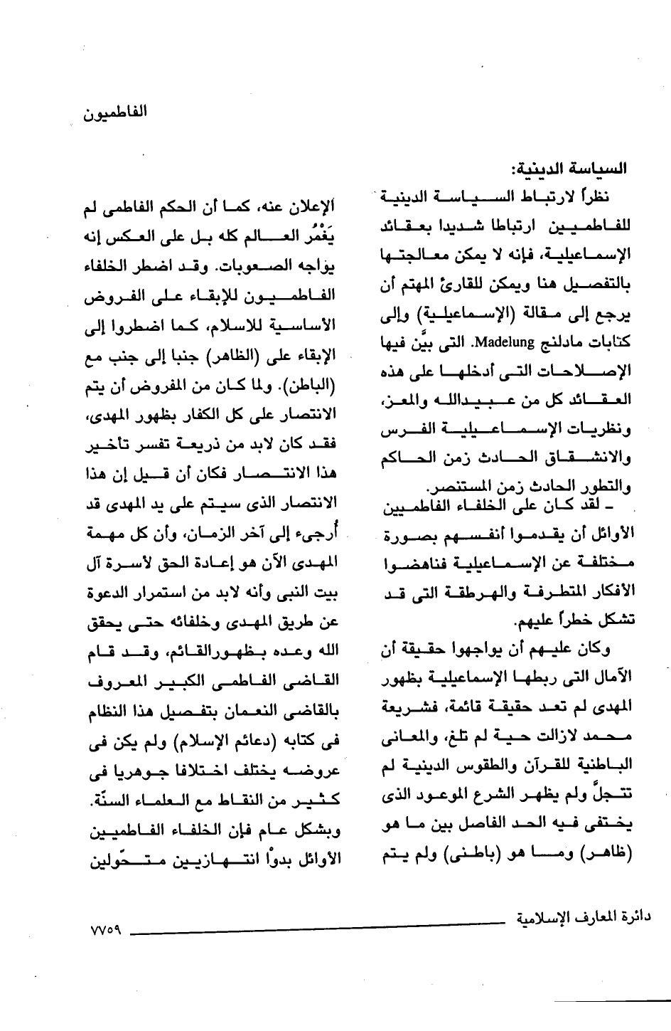 نظرًا لارتباط السياسة الدينية للفاطميين ارتباطا شديدا بعقائد الإسماعيلية، فإنه لا يمكن معالجتها بالتفصيل هنا ويمكن للقارئ المهتم أن يرجع إلى مقالة (الاسماعيلية) وإلى كتالات مادلنج Madelung، التى بيَّن فيها الإصلاحات التى أدخلها على هذه العقائد كل من عبيد اللَّه والمعز، ونظريات الاسماعيلية الفرس والانشقاق الحادث زمن الحاكم والتطور الحادث زمن المستنصر.
