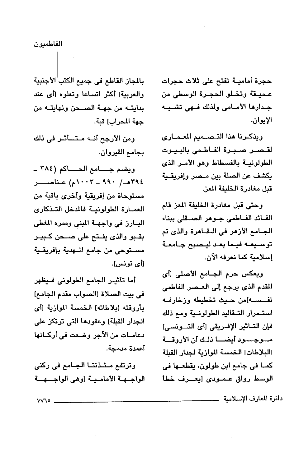 أما تأثير الجامع الطولونى فيظهر فى بيت الصلاة [الصواب مقدم الجامع] بأروقته [بلاطاته] الخمسة الموازية [أى الجدار القبلة] وعقودها التى ترتكز على دعامات من الآجر وضعت فى أركانها أعمدة مدمجة.