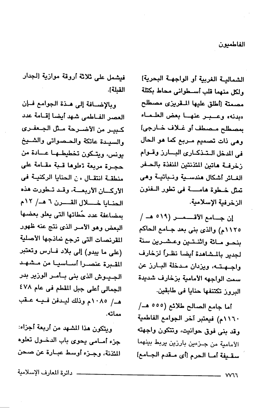أما جامع الصالح طلائع (555 هـ/ 1160 م) فيعتبر آخر الجوامع الفاطمية وقد بنى فوق حوانيت، وتتكون واجهته الأمامية من جزءين بارزين يربط بينهما سقيفة أما الحرم [أى مقدم الجامع] فيشمل على ثلاثة أروقة موازية [لجدار القبلة].