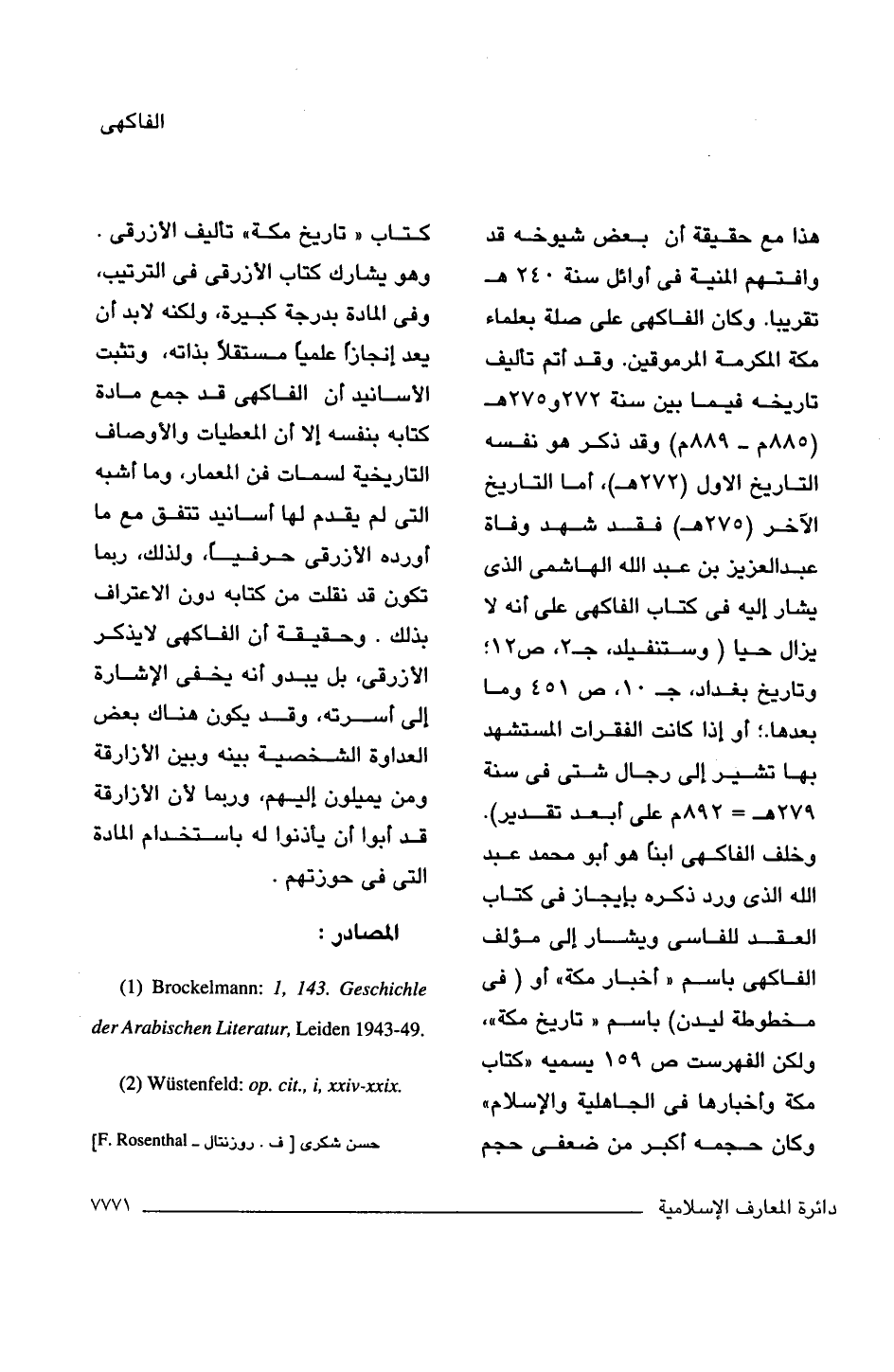 هذا مع حقيقة أن بعض شيوخه قد وافتهم المنية فى أوائل سنة 240 هـ تقريبًا. وكان الفاكهى على صلة بعلماء مكة المكرمة المرموقين. وقد أتم تأليف تاريخه فيما بين سنة 272 و 275 هـ (885 م - 889 م) وقد ذكر هو نفسه التاريخ الأول (272 هـ)، أما التاريخ الآخر (275 هـ) فقد شهد وفاة عبد العزيز بن عبد اللَّه الهاشمى الذى يشار إليه فى كتاب الفاكهى على أنه لا يزال حيا (وستنفيلد، جـ 2، ص 12؛ وتاريخ بغداد، جـ 10، ص 451 وما بعدها؛ أو إذا كانت الفقرات المستشهد بها تشير إلى رجال شتى فى سنة 279 هـ = 892 م على أبعد تقدير). وخلف الفاكهى ابنًا هو أبو محمد عبد اللَّه الذى ورد ذكره بإيجاز فى كتاب العقد للفاسى ويشار إلى مؤلف الفاكهى باسم "أخبار مكة" أو (فى مخطوطة ليدن) باسم "تاريخ مكة"، ولكن الفهرست ص 159 يسميه "كتاب مكة وأخبارها فى الجاهلية والإسلام" وكان حجمه أكبر من ضعفى حجم كتاب "تاريخ مكة" تأليف الأزرقى. وهو يشارك كتاب الأزرقى فى الترتيب، وفى المادة بدرجة كبيرة، ولكنه لابد أن يعد إنجازًا علميًا مستقلًا بذاته، وتثبت الأسانيد أن الفاكهى قد جمع مادة كتابه بنفسه إلا أن المعطيات والأوصاف التاريخية لسمات فن المعمار، وما أشبه التى لم يقدم لها أسانيد تتفق مع ما أورده الأزرقى حرفيًا، ولذلك، ربما تكون قد نقلت من كتابه دون الاعتراف بذلك. وحقيقة أن الفاكهى لا يذكر الأزرقى، بل يبدو أنه يخفى الإشارة إلى أسرته، وقد يكون هناك بعض العداوة الشخصية بينه وبين الأزارقة ومن يميلون إليهم، وربما لأن الأزارقة قد أبوا أن يأذنوا له باستخدام المادة التى فى حوزتهم.