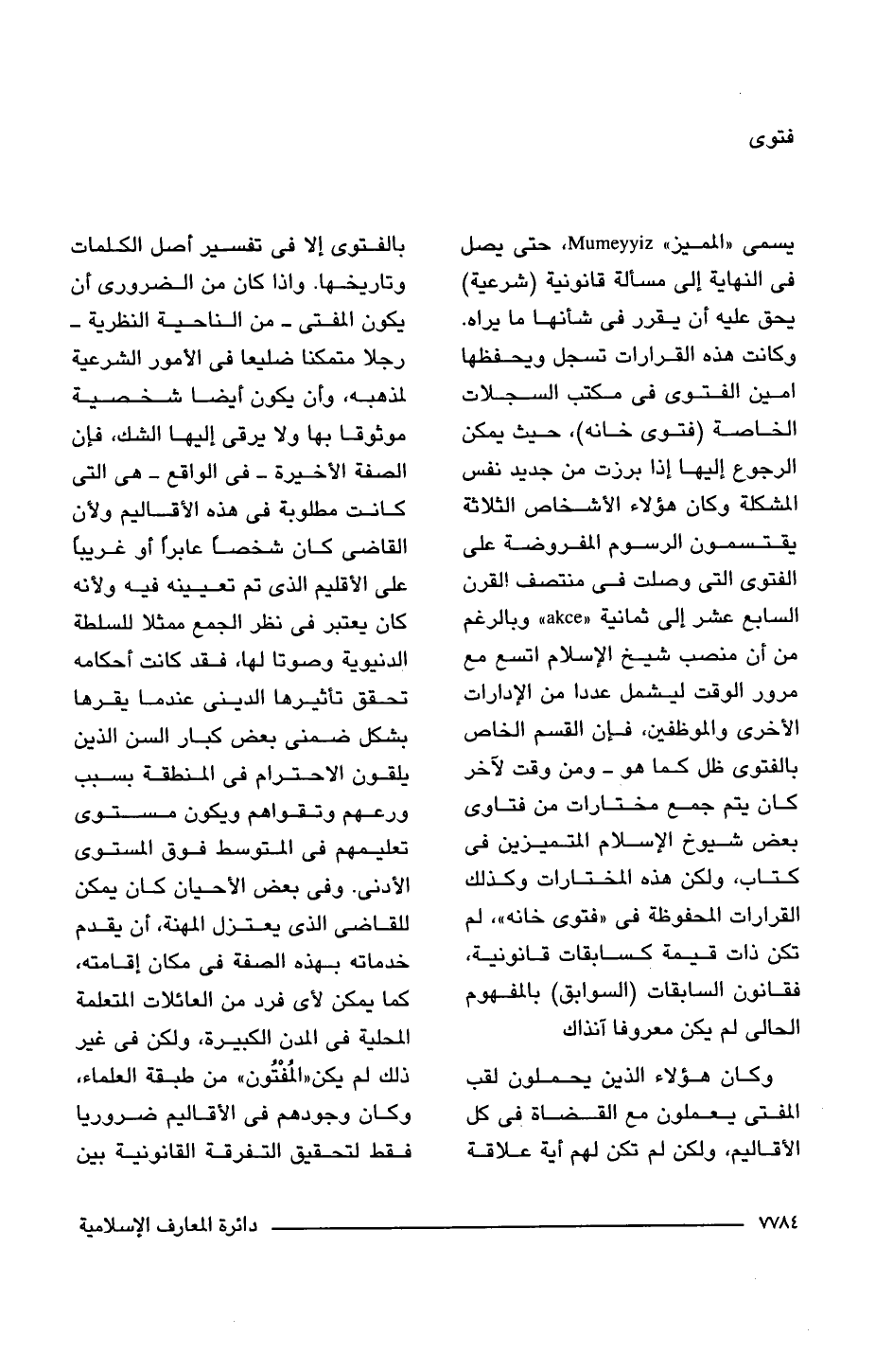 يسمى "المميز" Mumeyyiz، حتى يصل فى النهاية إلى مسألة قانونية (شرعية) يحق عليه أن يقرر فى شأنها ما يراه. وكانت هذه القرارات تسجل ويحفظها امين الفتوى فى مكتب السجلات الخاصة (فتوى خانه)، حيث يمكن الرجوع إليها إذا برزت من جديد نفس المشكلة وكان هؤلاء الأشخاص الثلاثة يقتسمون الرسوم المفروضة على الفتوى التى وصلت فى منتصف القرن السابع عشر إلى ثمانية " akce" وبالرغم من أن منصب شيخ الإسلام اتسع مع مرور الوقت ليشمل عددا من الإدارات الأخرى والموظفين، فإن القسم الخاص بالفتوى ظل كما هو -ومن وقت لآخر كان يتم جمع مختارات من فتاوى بعض شيوخ الإسلام المتميزين فى كتاب، ولكن هذه المختارات وكذلك القرارات المحفوظة فى "فتوى خانه"، لم تكن ذات قيمة كسابقات قانونية، فقانون السابقات (السوابق) بالمفهوم الحالى لم يكن معروفا آنذاك.