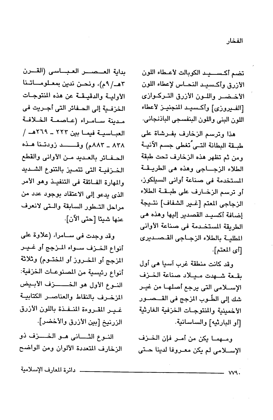 ومهما يكن من أمر فإن الخزف الإسلامى لم يكن معروفا لدينا حتى بداية العصر العباسى (القرن 3 هـ/ 9 م)، ونحن ندين بمعلوماتنا الأولية والدقيقة عن هذه المنتوجات الخزفية إلى الحفائر التى أجريت فى مدينة سامراء (عاصمة الخلافة العباسية فيما بين 223 - 269 هـ/ 838 - 883 م) وقد زودتنا هذه الحفائر بالعديد من الأوانى والقطع الخزفية التى تتميز بالتنوع الشديد والمهارة الفائقة فى التنفيذ وهو الأمر الذى يدعو إلى الاعتقاد بوجود عدد من مراحل التطور السابقة والتى لا نعرف عنها شيئا [حتى الآن].