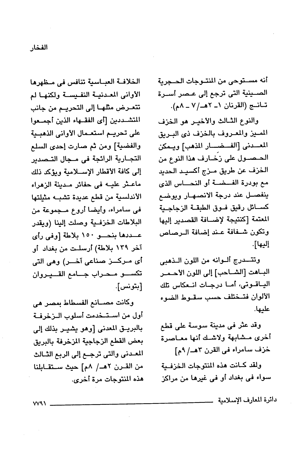وكانت مصانع الفسطاط بمصر هى أول من استخدمت أسلوب الزخرفة بالبريق المعدنى [وهو يشير بذلك إلى بعض القطع الزجاجية المزخرفة بالبريق المعدنى والتى ترجع إلى الربع الثالث من القرن 2 هـ/ 8 م] حيث ستقابلنا هذه المنتوجات مرة أخرى.