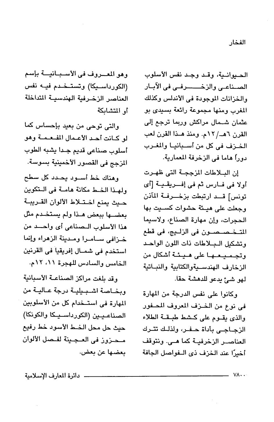 الحيوانية، وقد وجد نفس الأسلوب الصناعى والزخرفى فى الآبار والخزانات الموجودة فى الأندلس وكذلك المغرب ومنها مجموعة رائعة بسيدى بو عثمان شمال مراكش وربما ترجع إلى القرن 6 هـ/ 12 م. ومنذ هذا القرن لعب الخزف فى كل من أسبانيا والمغرب دورًا هاما فى الزخرفة المعمارية.