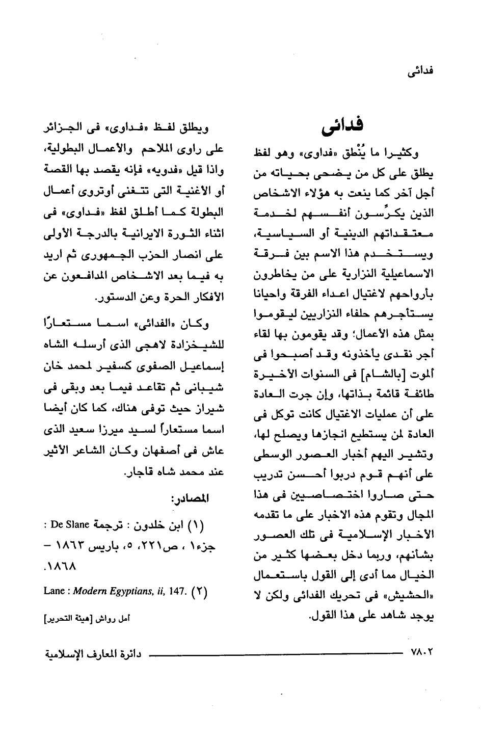 وكثيرا ما يُنْطق "فداوى" وهو لفظ يطلق على كل من يضحى بحياته من أجل آخر كما ينعت به هؤلاء الأشخاص الذين يكرِّسون أنفسهم لخدمة معتقداتهم الدينية أو السياسية، ويستخدم هذا الاسم بين فرقة الاسماعيلية النزارية على من يخاطرون بأرواحهم لاغتيال أعداء الفرقة وأحيانا يستأجرهم حلفاء النزاريين ليقوموا بمثل هذه الأعمال؛ وقد يقومون بها لقاء أجر نقدى يأخذونه وقد أصبحوا فى الموت [بالشام] فى السنوات الأخيرة طائفة قائمة بذاتها، وإن جرت العادة على أن عمليات الاغتيال كانت توكل فى العادة لمن يستطيع انجازها ويصلح لها، وتشير إليهم أخبار العصور الوسطى على أنهم قوم دربوا أحسن تدريب حتى صاروا اختصاصيين فى هذا المجال وتقوم هذه الأخبار على ما تقدمه الأخبار الإسلامية فى تلك العصور بشأنهم، وربما دخل بعضها كثير من الخيال مما أدى إلى القول باستعمال "الحشيش" فى تحريك الفدائى ولكن لا يوجد شاهد على هذا القول.
