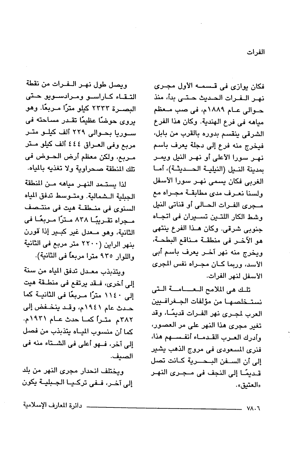 تلك هى الملامح العامة التى نستخلصها من مؤلفات الجغرافيين العرب لمجرى نهر الفرات قديمًا، وقد تغير مجرى هذا النهر على مر العصور، وأدرك العرب القدماء أنفسهم هذا، فنرى المسعودى فى مروج الذهب يشير إلى أن السفن البحرية كانت تصل قديمًا إلى النجف فى مجرى النهر "العتيق".