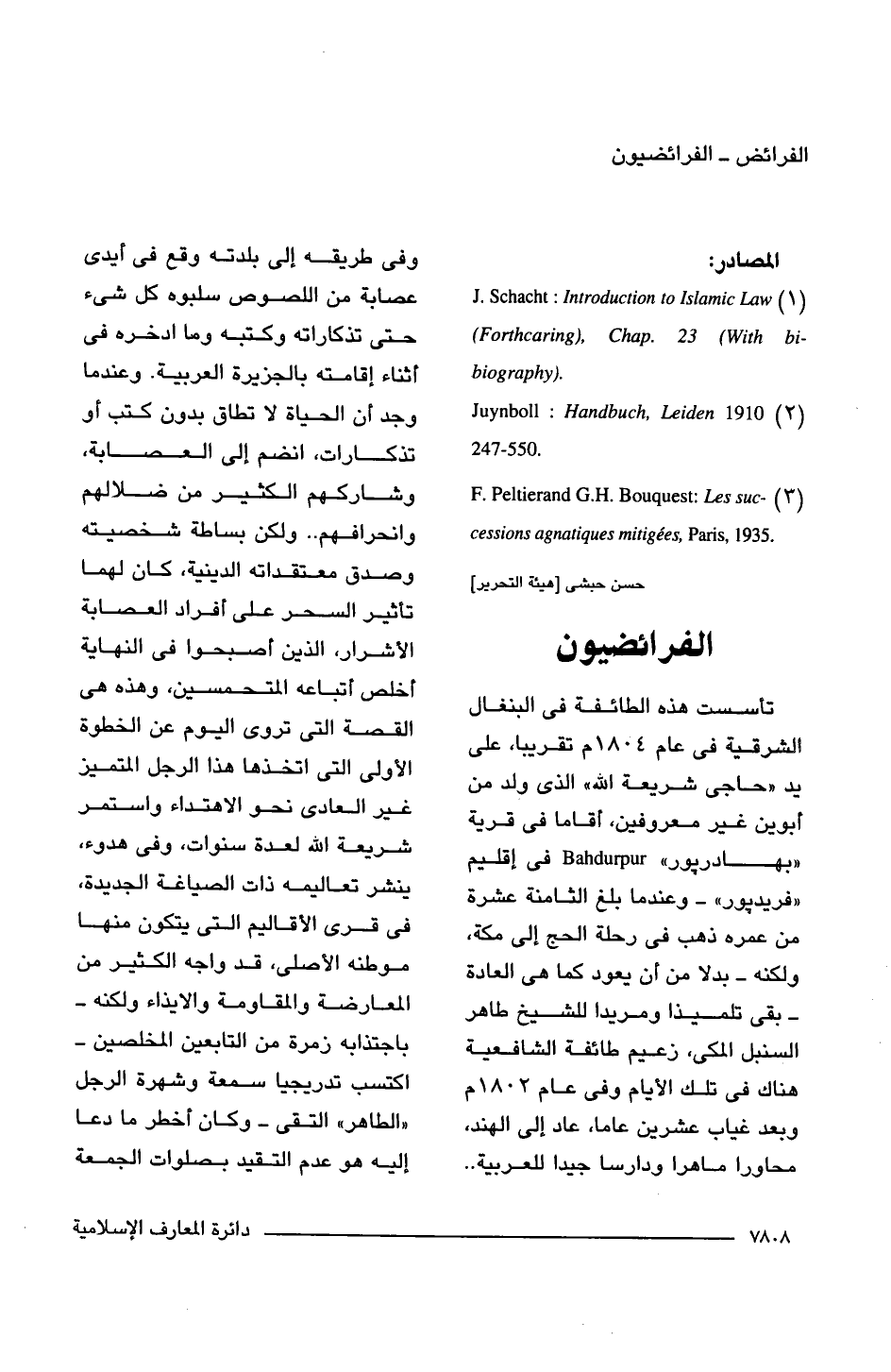 تأسست هذه الطائفة فى البنغال الشرقية فى عام 1804 م تقريبًا، على يد "حاجى شريعة اللَّه" الذى ولد من أبوين غير معروفين، أقاما فى قرية "بهادريور" Bahdurpur فى إقليم "فريدبور" -وعندما بلغ الثامنة عشرة من عمره ذهب فى رحلة الحج إلى مكة، ولكنه -بدلا من أن يعود كما هى العادة- بقى تلميذا ومريدا للشيخ طاهر السنبل المكى، زعيم طائفة الشافعية هناك فى تلك الأيام وفى عام 1802 م وبعد غياب عشرين عاما، عاد إلى الهند، محاورا ماهرا ودارسا جيدا للعربية. . وفى طريقه إلى بلدته وقع فى أيدى عصابة من اللصوص سلبوه كل شئ حتى تذكاراته وكتبه وما ادخره فى أثناء إقامته بالجزيرة العربية. وعندما وجد أن الحياة لا تطاق بدون كتب أو تذكارات، انضم إلى العصابة، وشاركهم الكثير من ضلالهم وانحرافهم. . ولكن بساطة شخصيته وصدق معتقداته الدينية، كان لهما تأثير السحر على أفراد العصابة الأشرار، الذين أصبحوا فى النهاية أخلص أتباعه المتحمسين، وهذه هى القصة التى تروى اليوم عن الخطوة الأولى التى اتخذها هذا الرجل المتميز غير العادى نحو الاهتداء واستمر شريعة اللَّه لعدة سنوات، وفى هدوء، ينشر تعاليمه ذات الصياغة الجديدة، فى قرى الأقاليم التى يتكون منها موطنه الأصلى، قد واجه الكثير من المعارضة والمقاومة والايذاء ولكنه -باجتذابه زمرة من التابعين المخلصين- اكتسب تدريجيا سمعة وشهرة الرجل "الطاهر" التقى -وكان أخطر ما دعا إليه هو عدم التقيد بصلوات الجمعة