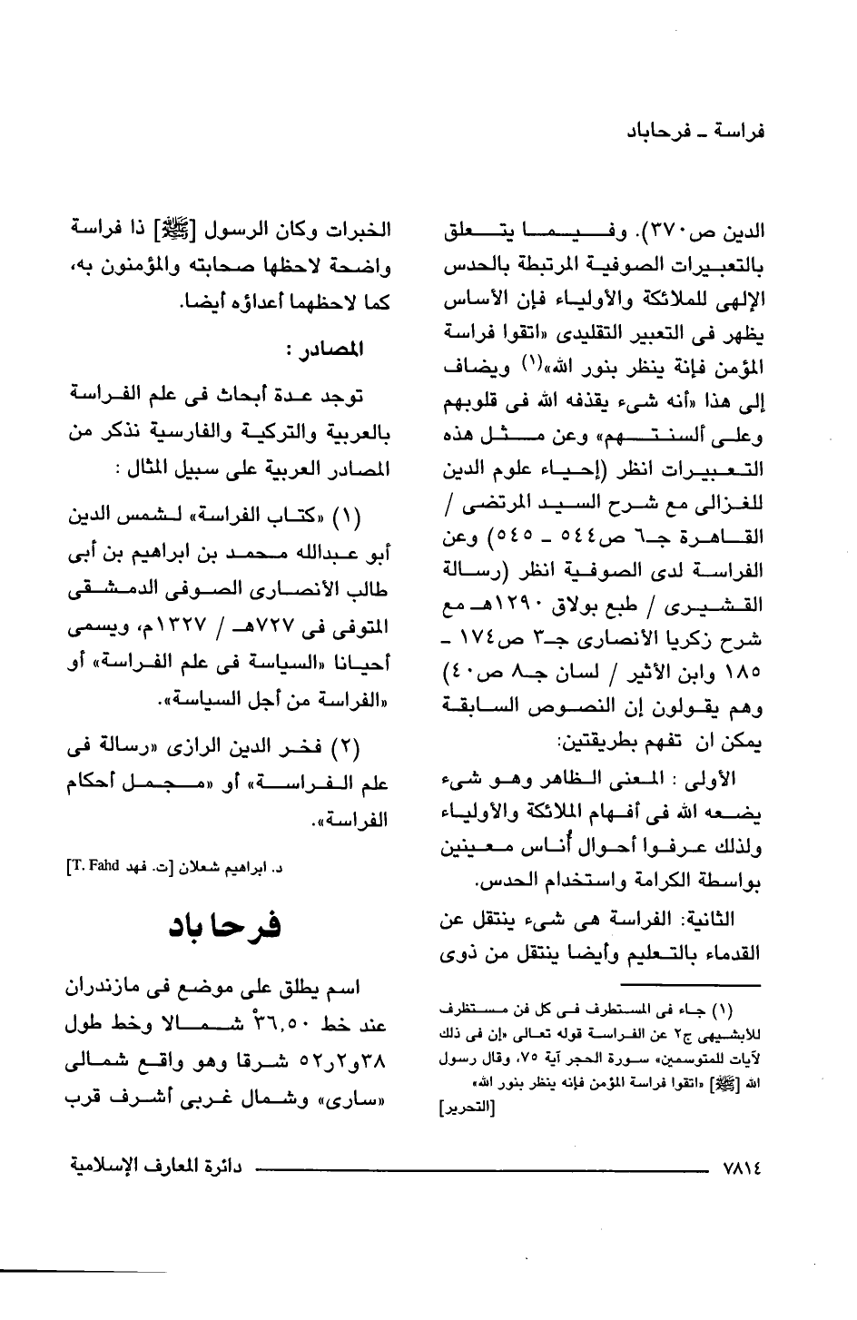 (¬1) جاء فى المستطرف فى كل فن مستظرف للأبشيهى جـ 2 عن الفراسة قوله تعالى {إِنَّ فِي ذَلِكَ لَآيَاتٍ لِلْمُتَوَسِّمِينَ} سورة الحجر آية 75، وقال رسول اللَّه [-صلى اللَّه عليه وسلم-] "اتقوا فراسة المؤمن فإنه ينظر بنور اللَّه" [التحرير]