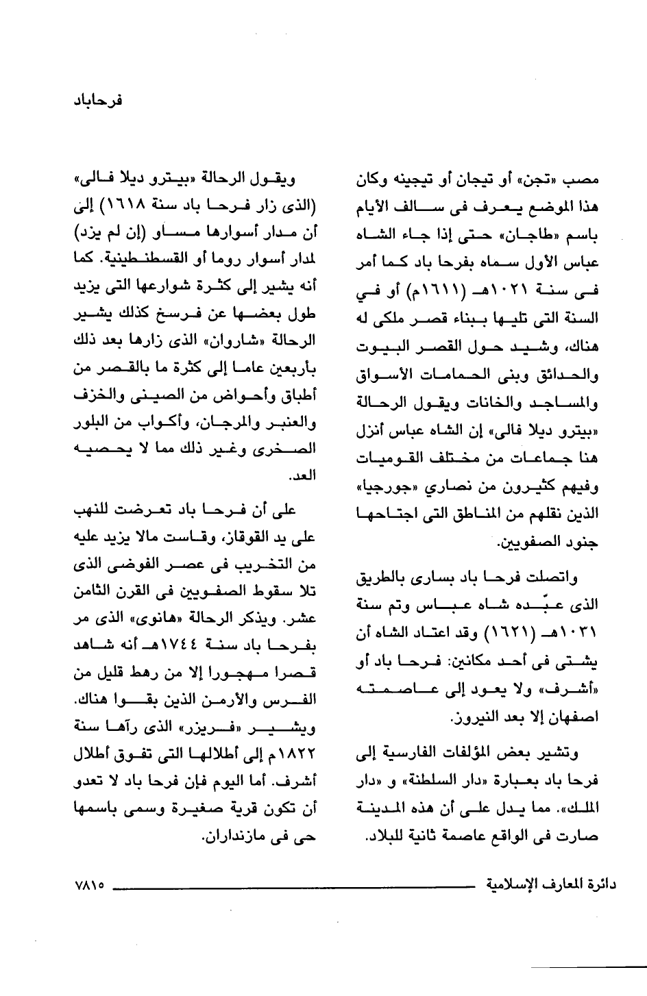 مصب "تجن" أو تيجان أو تيجينه وكان هذا الموضع يعرف فى سالف الأيام باسم "طاجان" حتى إذا جاء الشاه عباس الأول سماه بفرحا باد كما أمر فى سنة 1021 هـ (1611 م) أو فى السنة التى تليها ببناء قصر ملكى له هناك، وشيد حول القصر البيوت والحدائق وبنى الحمامات الأسواق والمساجد والخانات ويقول الرحالة "بيترو ديلا فالى" إن الشاه عباس أنزل هنا جماعات من مختلف القوميات وفيهم كثيرون من نصارى "جورجيا" الذين نقلهم من المناطق التى اجتاحها جنود الصفويين.