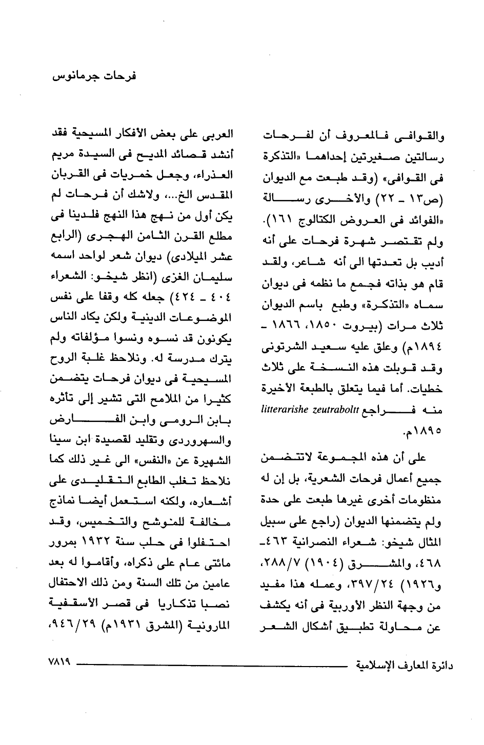 على أن هذه المجموعة لا تتضمن جميع أعمال فرحات الشعرية، بل إن له منظومات أخرى غيرها طبعت على حدة ولم يتضمنها الديوان (راجع على سبيل المثال شيخو: شعراء النصرانية 463 - 468, والمشرق (1904) 7/ 288، و 1926) 24/ 397, وعمله هذا مفيد من وجهة النظر الأوربية فى أنه يكشف عن محاولة تطبيق أشكال الشعر العربى على بعض الأفكار المسيحية فقد انشد قصائد المديح فى السيدة مريم العذراء، وجعل خمريات فى القربان المقدس الخ. . .، ولاشك أن فرحات لم يكن أول من نهج هذا النهج فلدينا فى مطلع القرن الثامن الهجرى (الرابع عشر الميلادى) ديوان شعر لواحد اسمه سليمان الغزى (انظر شيخو: الشعراء 404 - 424) جعله كله وقفا على نفس الموضوعات الدينية ولكن يكاد الناس يكونون قد نسوه ونسوا مؤلفاته ولم يترك مدرسة له. ونلاحظ غلبة الروح المسيحية فى ديوان فرحات يتضمن كثيرا من الملامح التى تشير إلى تأثره بابن الرومى وابن الفارض والسهروردى وتقليد لقصيدة ابن سينا الشهيرة عن "النفس" إلى غير ذلك كما نلاحظ تغلب الطابع التقليدى على أشعاره، ولكنه استعمل أيضا نماذج مخالفة للموشح والتخميس، وقد احتفلوا فى حلب سنة 1932 بمرور مائتى عام على ذكراه، وأقاموا له بعد عامين من تلك السنة ومن ذلك الاحتفال نصبا تذكاريا فى قصر الأسقفية المارونية (المشرق 1931 م) 29/ 946,