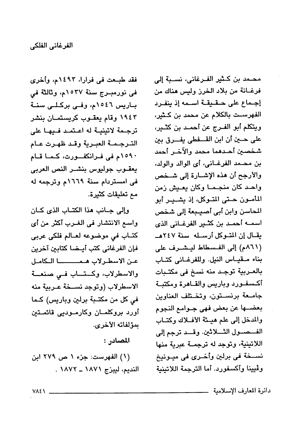 محمد بن كثير الفرغانى، نسبة إلى فرغانة من بلاد الخرز وليس هناك من إجماع على حقيقة اسمه إذ ينفرد الفهرست بالكلام عن محمد بن كثير، ويتكلم أبو الفرج عن أحمد بن كثير، على حين أن ابن القفطى يفرق بين شخصين أحدهما محمد والآخر أحمد بن محمد الفرغانى، أى الوالد والولد، والأرجح أن هذه الإشارة إلى شخص واحد كان منجما وكان يعيش زمن المأمون حتى المتوكل، إذ يشير أبو المحاسن وابن أبى أصيبعة إلى شخص اسمه أحمد بن كثير الفرغانى الذى يقال إن المتوكل أرسله سنة 247 هـ (861 م) إلى الفسطاط ليشرف على بناء مقياس النيل. وللفرغانى كتاب بالعربية توجد منه نسخ فى مكتبات أكسفورد وباريس والقاهرة ومكتبة جامعة برنستون، وتختلف العناوين بعضها عن بعض فهى جوامع النجوم والمدخل إلى علم هيئة الأفلاك وكتاب الفصول الثلاثين. وقد ترجم إلى اللاتينية، وتوجد له ترجمة عبرية منها نسخة فى برلين وأخرى فى ميونيخ وفيينا وأكسفورد. أما الترجمة اللاتينية فقد طبعت فى فرارا، 1493 م، وأخرى فى نورمبرج سنة 1537 م، وثالثة فى باريس 1546 م، وفى بركلى سنة 1943 وقام يعقوب كريستمان بنشر ترجمة لاتينية له اعتمد فيها على الترجمة العبرية وقد ظهرت عام 1590 م فى فرانكفورت، كما قام يعقوب جوليوس بنشر النص العربى فى امستردام سنة 1669 م وترجمه له مع تعليقات كثيرة.